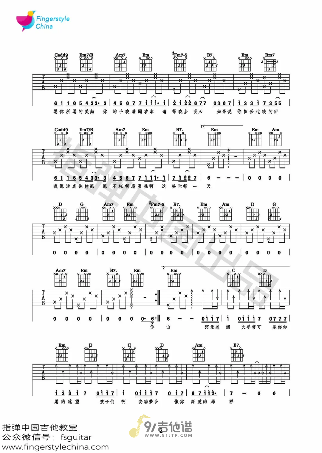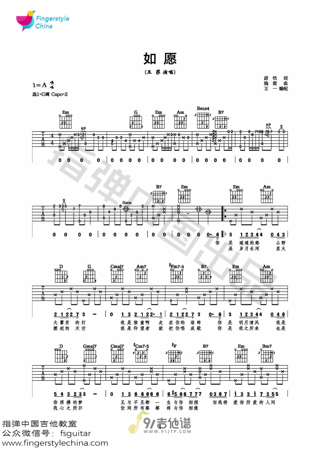 曲谱介绍: 《如愿》是电影《我和我的父辈》的主题推广曲,由王菲演唱。父母一辈为之奋斗的一幕幕,在子女一辈的时代得以实现,这便是歌名“如愿”的含义。作词者唐恬则表示,曲的指引、王菲的语气和故事本身的力量,汇成了她的创作。歌曲原调为A调,这里采用了G调指法进行编配,演唱时夹变调夹2品可回到原调。