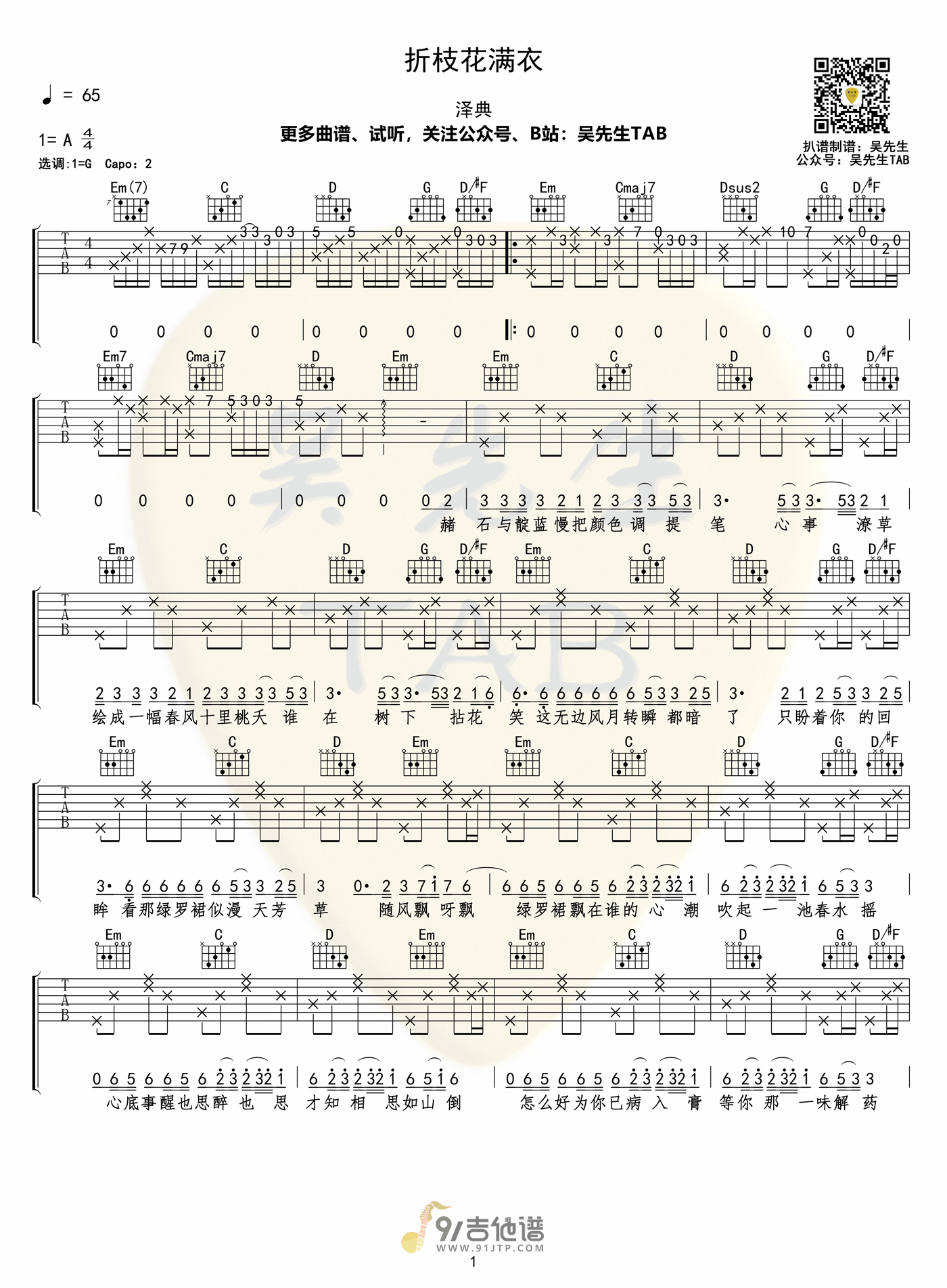 曲谱介绍: 《折枝花满衣》吉他谱分享,《折枝花满衣》是由泽典演唱的一首古风歌曲,这首歌词曲优美,韵律齐整,泽典声音缠绵婉转,细腻悠扬