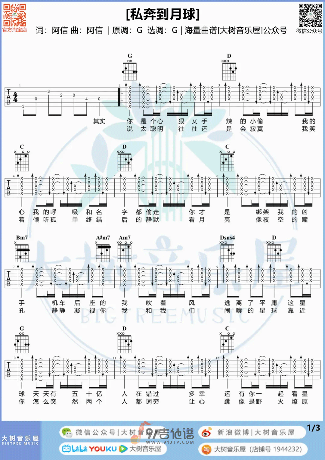 曲谱介绍: 《私奔到月球》吉他谱 附带教学视频,《私奔到月球》是由阿信填词谱曲,陈绮贞与五月天歌唱的一首情歌,如果说要把青春期那些百听不厌甜蜜情歌整理成歌单,这首歌一定榜上有名。歌曲以朗朗上口的旋律和清奇的脑路,勾勒出热恋情侣的幸福点滴。加上陈绮贞甜润娇美的嗓音,一开口,满是阳光温暖的青春气质。与五月天的清澈自然相得益彰,在浪漫而欢快的曲调中演绎得浪漫无比。