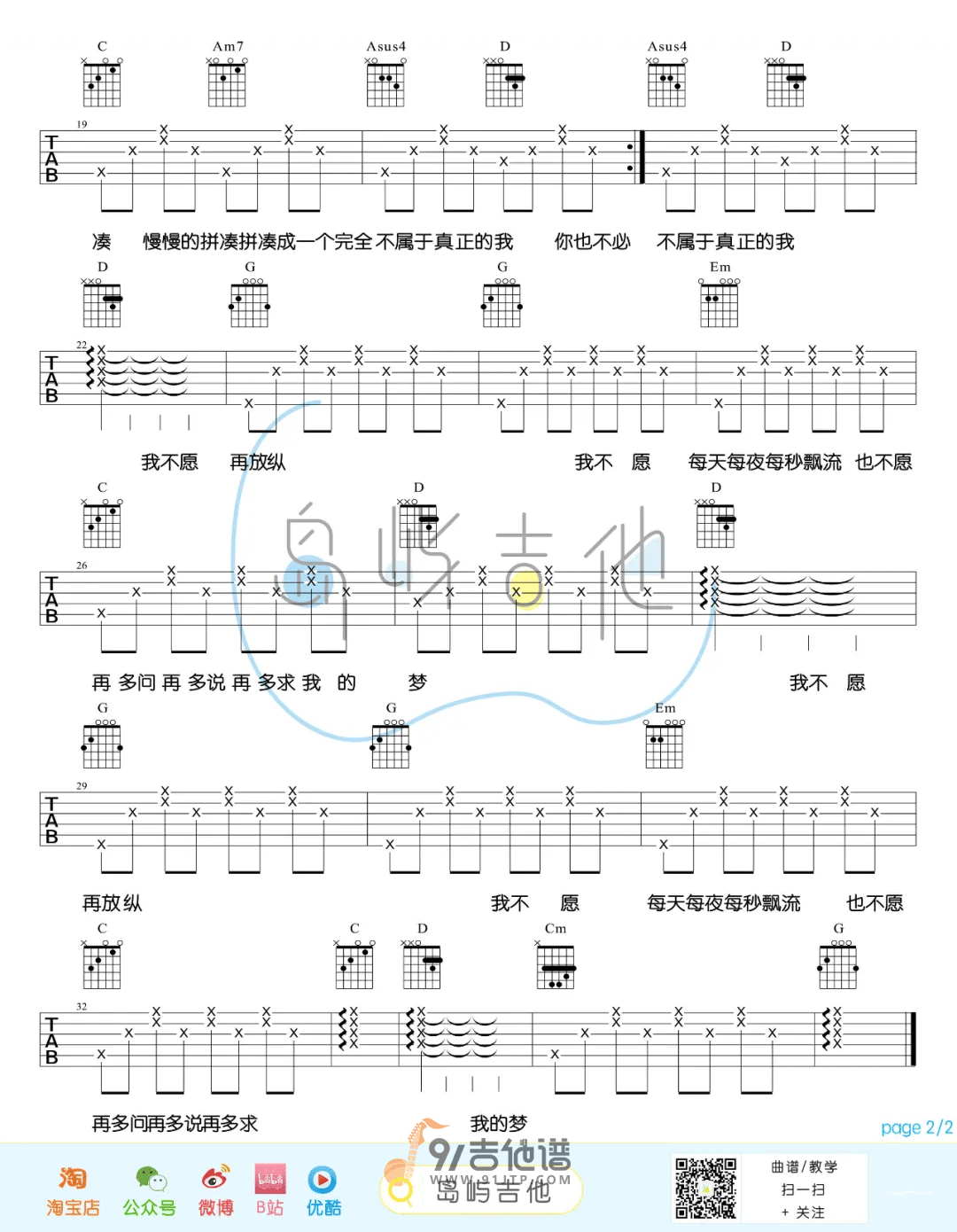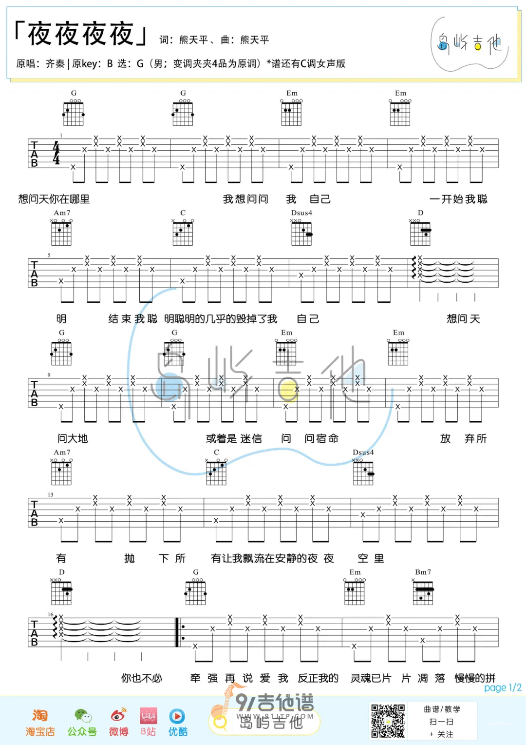 曲谱介绍: 《夜夜夜夜》吉他谱,《夜夜夜夜》是由齐秦1996年演唱的一首歌曲,这首歌的歌名是每一夜的意思,但是用单字“夜”的四次重复明显要好过“夜夜”或是“每一夜”,更具美感与诗意,统领了全文忧愁怅惘的色彩,并且为全文确定了一个自始而终的场景因素——夜晚。正文歌词以“问”开头,之后层层递进。向天询问“你在哪里”,天自然不会回答,所以作者转而扪心自问,将回忆用两句话清晰的概括,是自己的“聪明”酿造了今日的苦果。