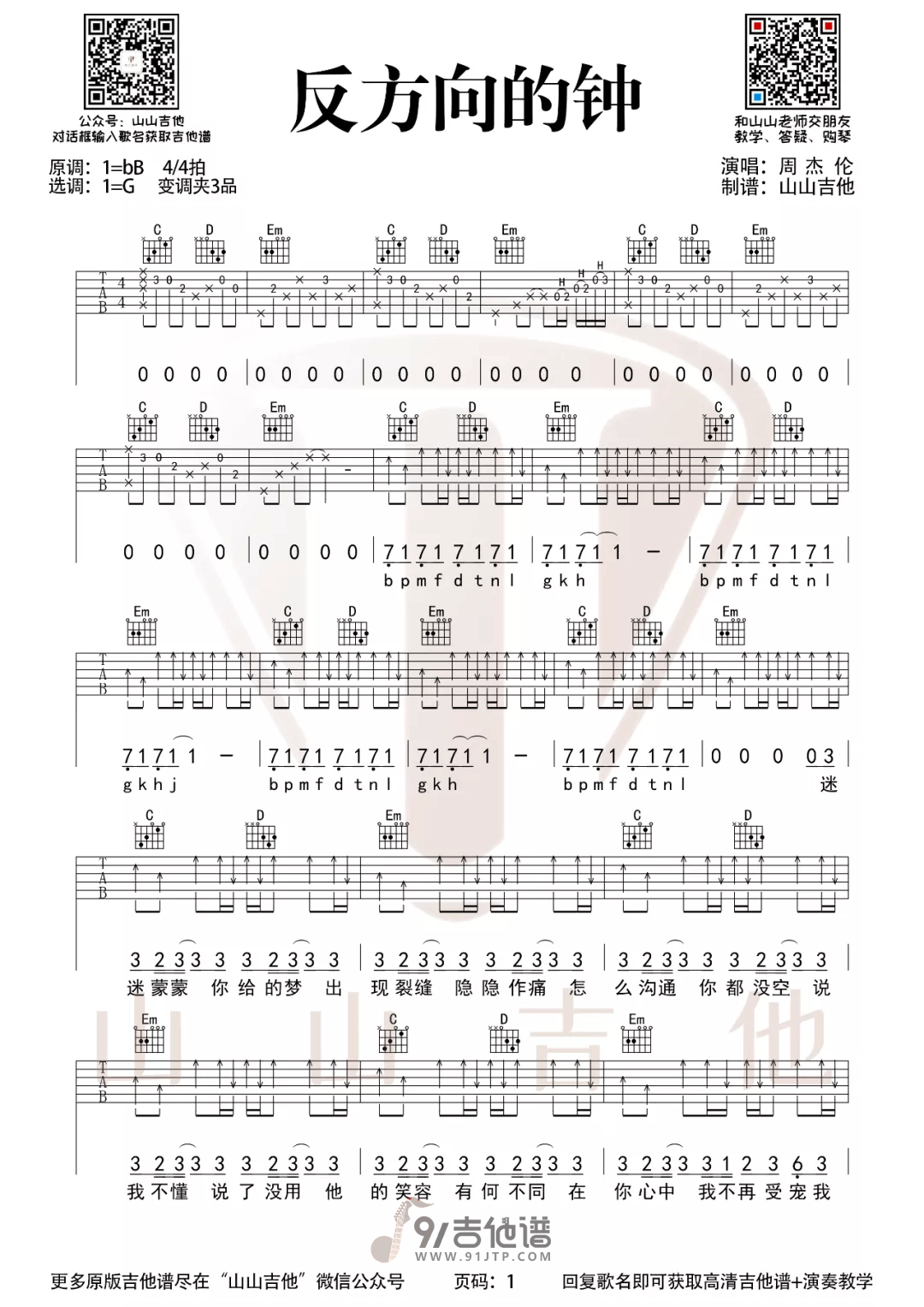 曲谱介绍: 《反方向的钟》是由周杰伦作曲并演唱的歌曲,这首歌也是日本电视剧《魔影紫光》的普通话译制版片头曲。初听这歌时感觉是哀怨的唱调配上复杂的旋律,是一首旋律奇怪但又莫名觉得好听的一首歌,把歌词传达的感情展示给我们听众,在MV里有切合《反方向的钟》这个歌名的画面:把整个画面倒放。