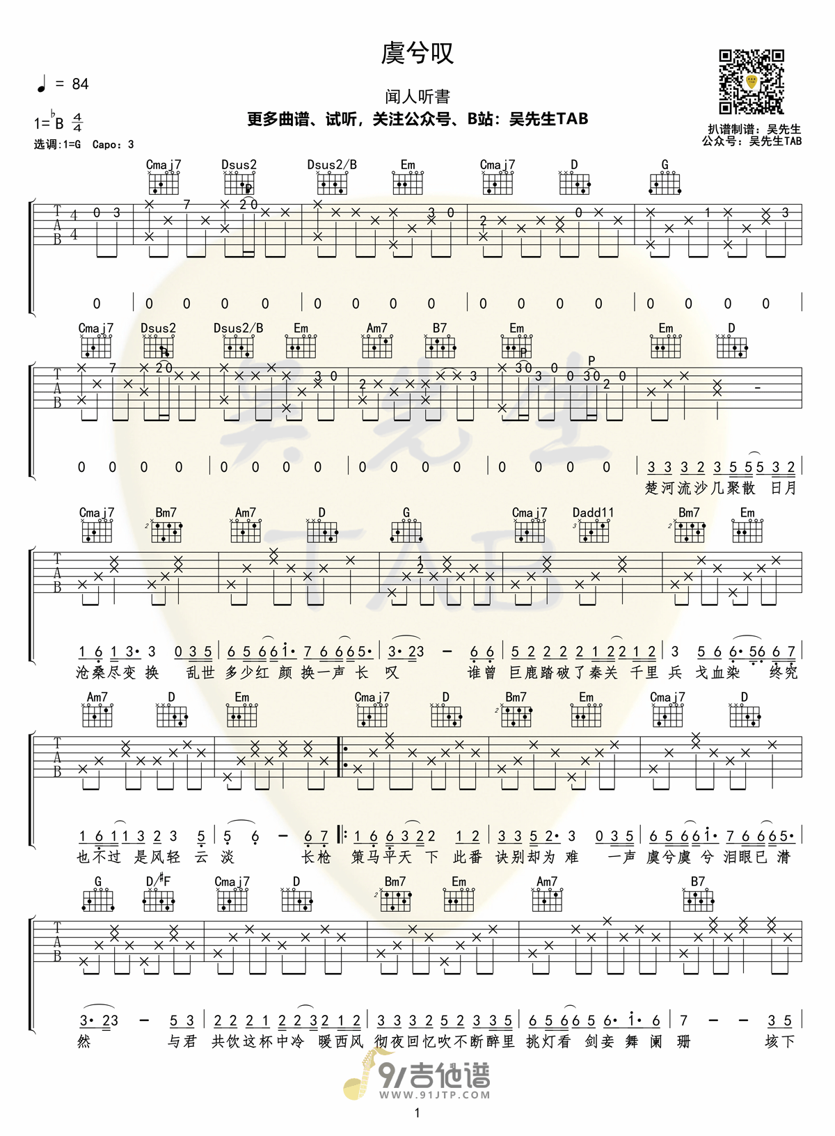 虞兮叹吉他谱 - Guitar - G调吉他弹唱谱 - 原版