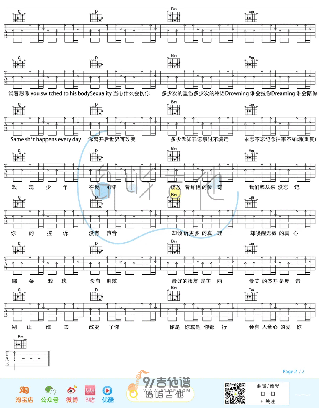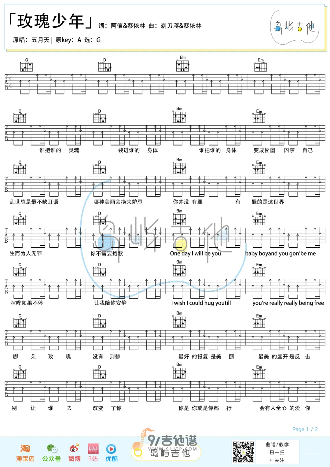 曲谱介绍: 《玫瑰少年》吉他谱分享,《玫瑰少年》是由蔡依林、阿信作词,五月天翻唱的一首歌曲,原唱为蔡依林。如果说蔡依林版的《玫瑰少年》是与少年们面对面的温情对话,抚平他们被社会偏见割开的伤口,那么五月天的版本就是对世界的犀利宣言,是为了尊重和公平做出的反击。相比原版Tropical House风格较为舒缓放松的节奏,五月天的版本充满摇滚的力量感,情感的爆发更加猛烈。