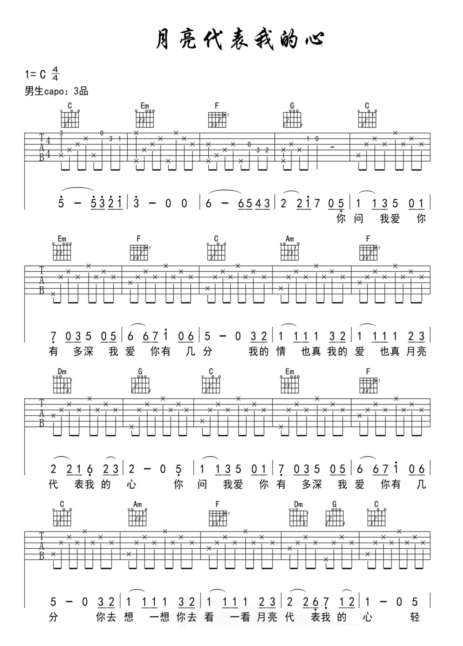 • 月亮代表我的心吉他谱 - 邓丽君 - C调吉他弹唱谱 - 新手入门吉他谱第1张