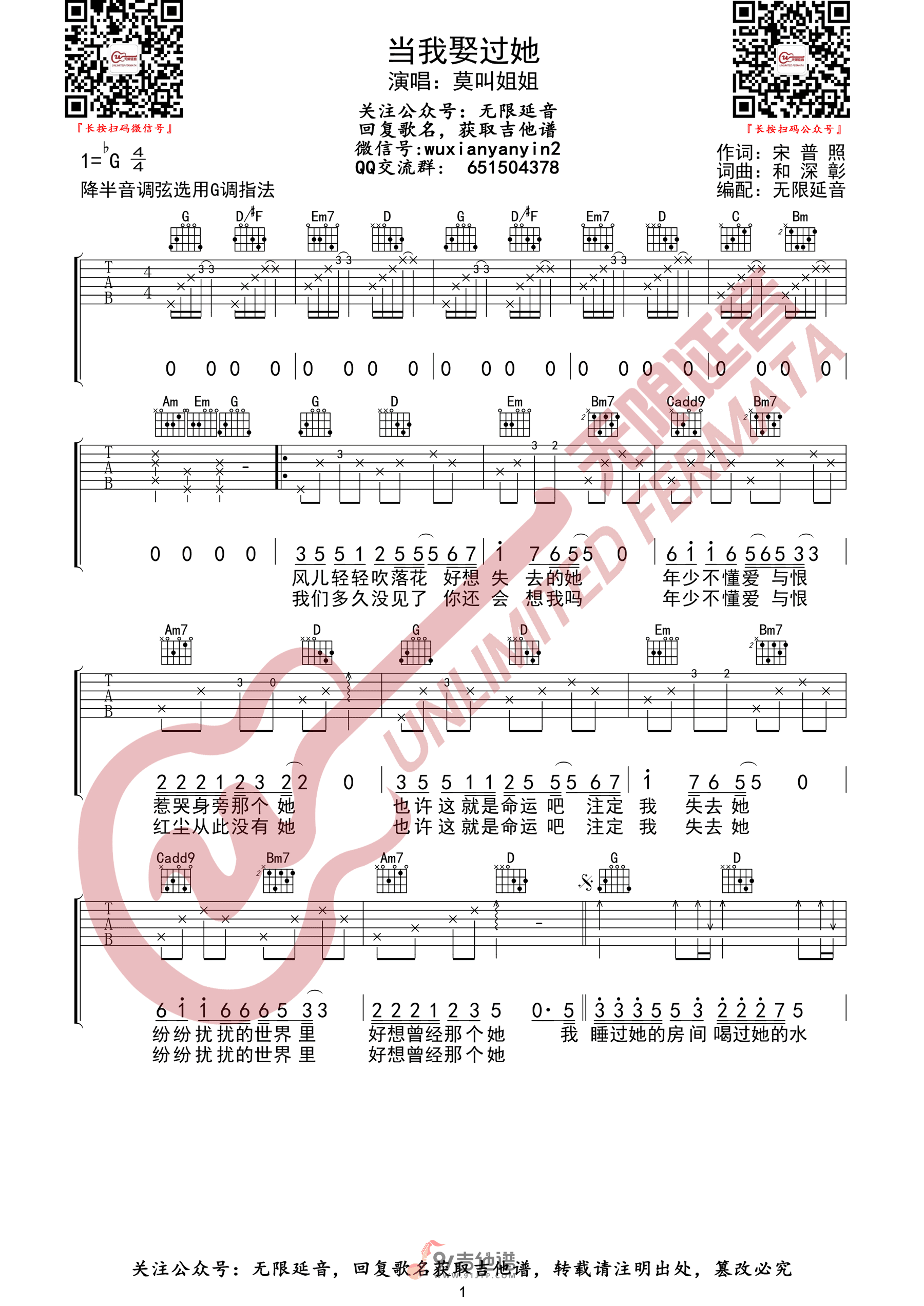 曲谱介绍: 《当我娶过她》吉他谱分享,《当我娶过她》是由莫叫姐姐演唱的一首网络热门单曲,“纷纷扰扰世界里,好想拥有一个家”,莫叫姐姐伤感独特的嗓音,将情感演绎入木三分。歌曲原调为降G调,这里采用了G调指法进行编配,演唱时降半音调弦可回到原调,也可以根据自己的嗓音情况夹,谱子整体难度不大。