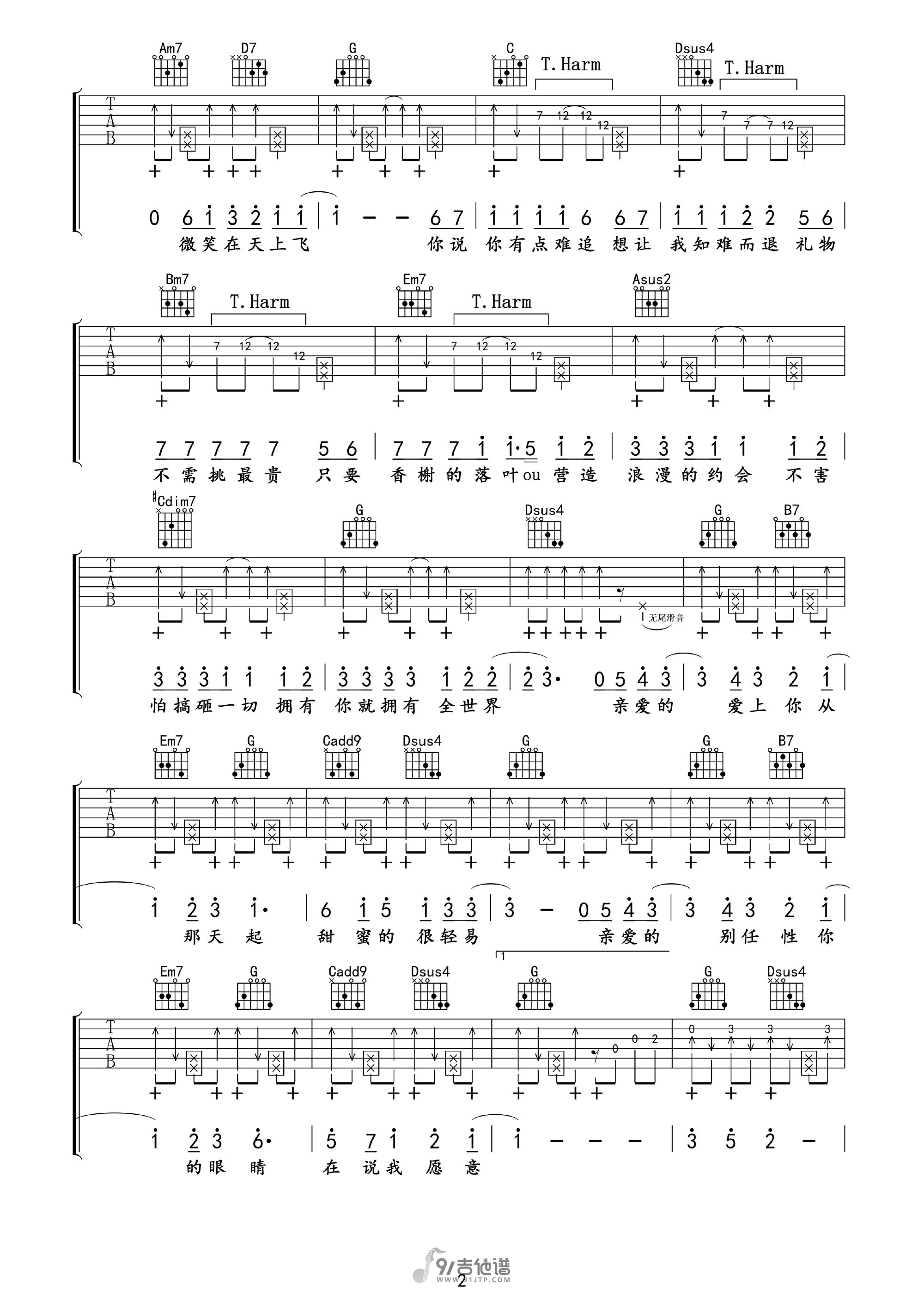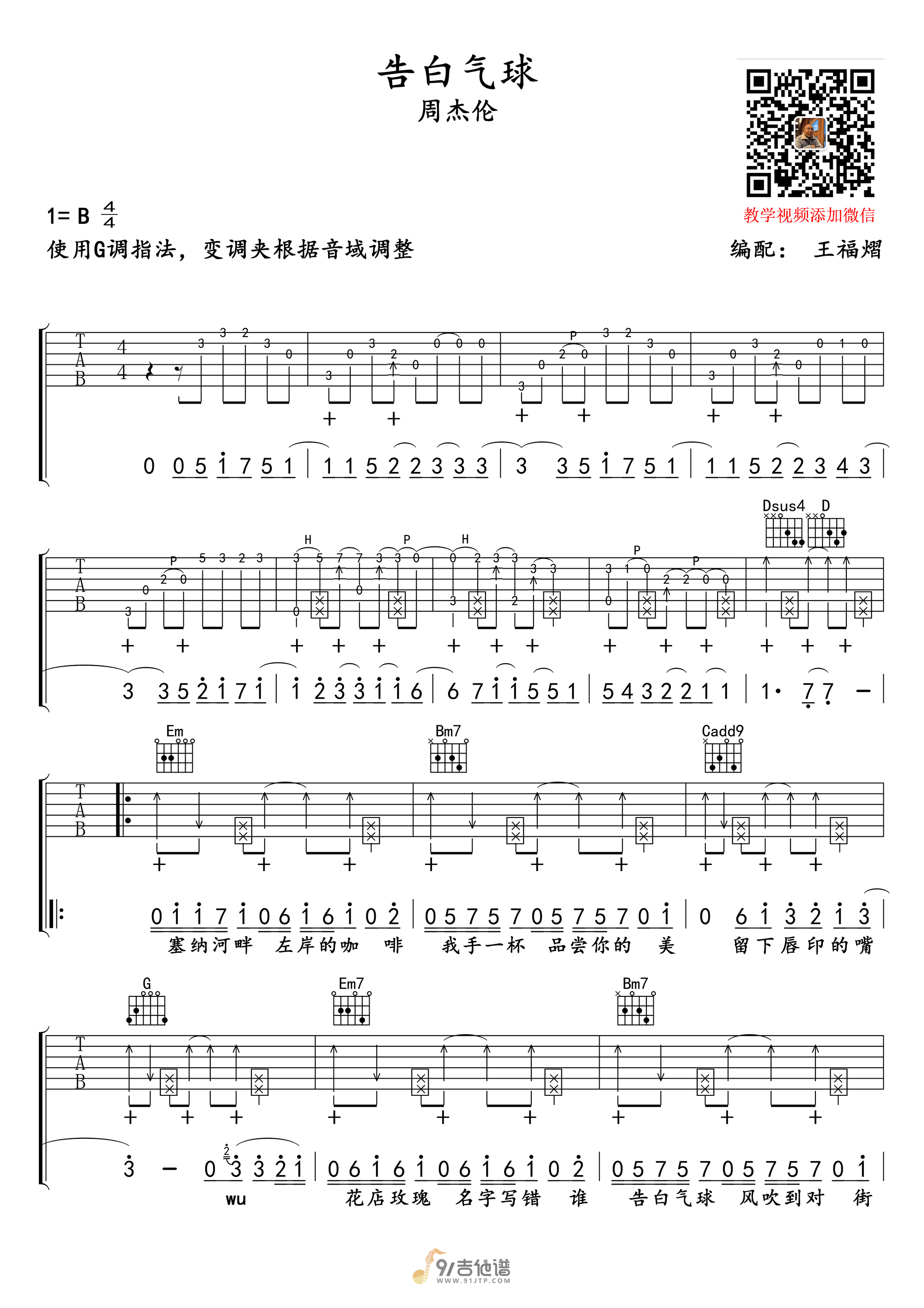 曲谱介绍: 曲谱简介:《告白气球》是由周杰伦和方文山合作的一首甜蜜情歌,由周杰伦演唱,方文山用气球来描述女生说很难追的小趣味,让这首歌的情节更浪漫。歌曲原调为B调,这里采用了G调指法进行编配,演唱时夹变调夹4品可回到原调,曲谱难度适中,不懂的地方可以参考教学视频练习。
