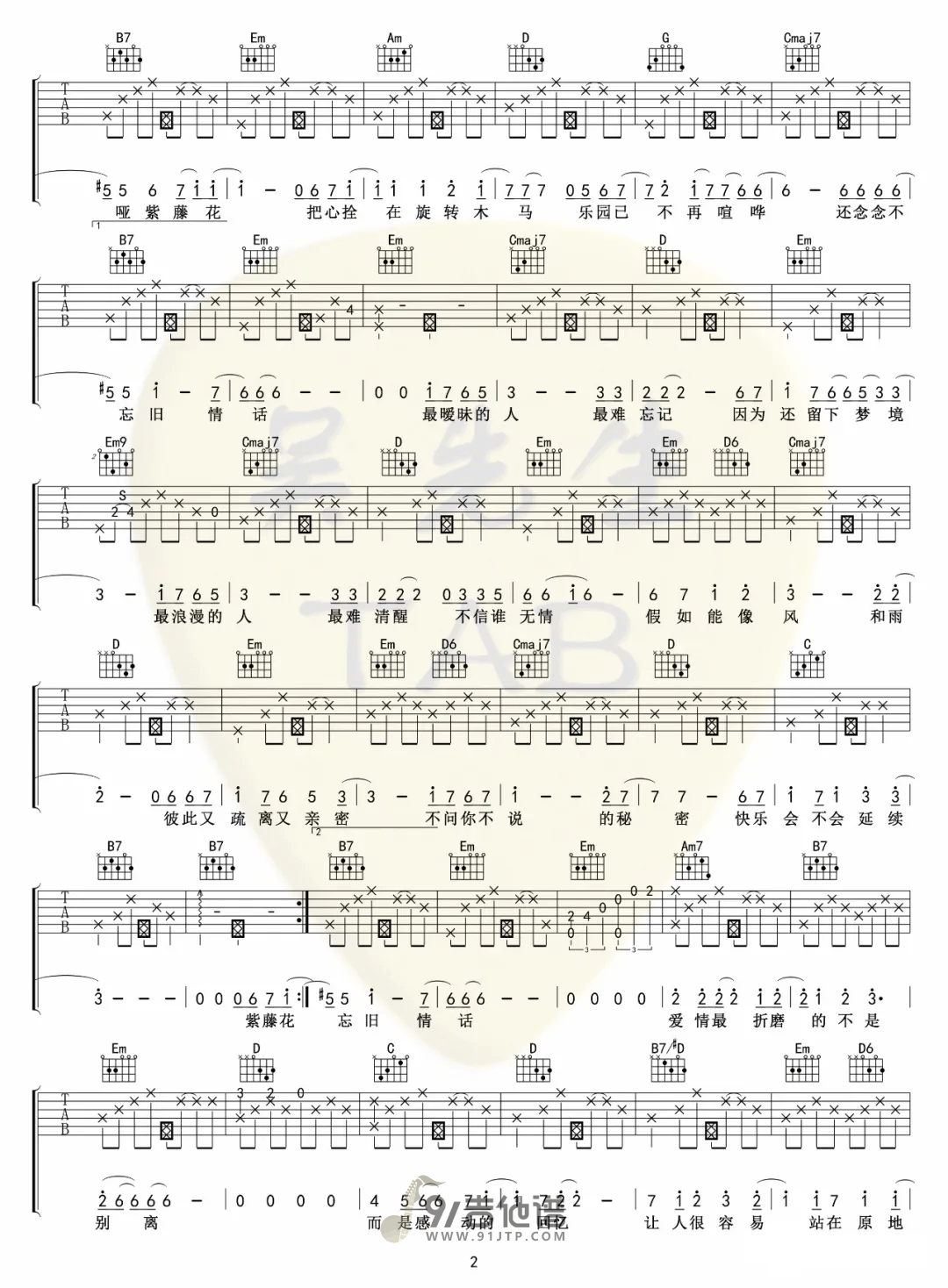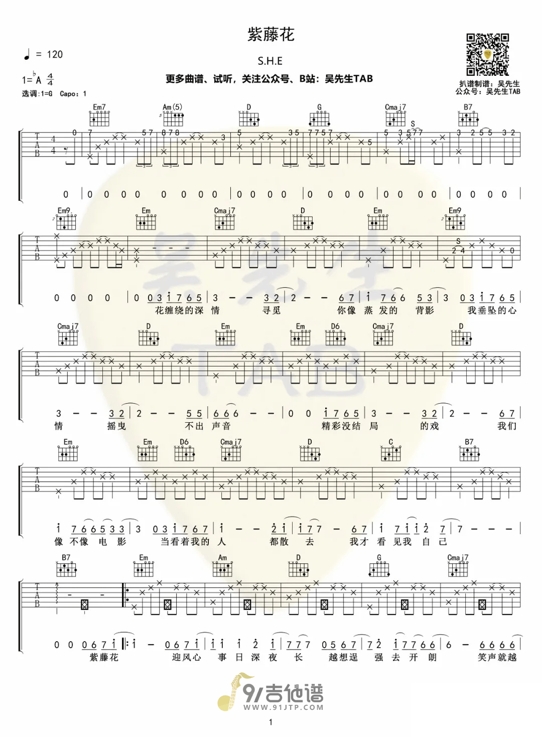 曲谱介绍: 《紫藤花》吉他谱分享,《紫藤花》是由S.H.E演唱的一首伤感情歌,原曲是Westlife的《Soledad》。这首歌曲充满浓浓拉丁风情,每次听这首歌时,有时感觉自己像是独自漫步在大雪覆盖的路上,有时又感觉像是独自站在山顶,被阳光温暖着。这首歌前奏和尾奏比较难,其他部分都挺简单的。