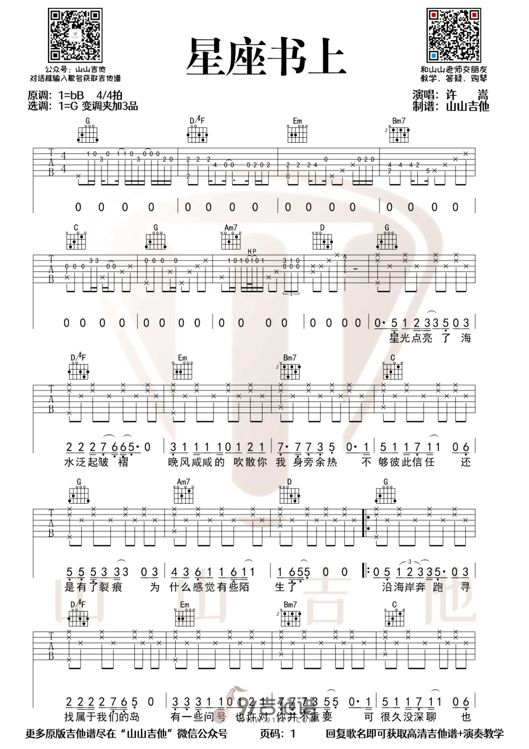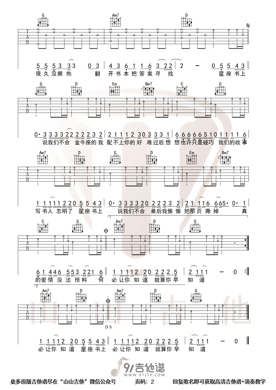 曲谱介绍: 《星座书上》吉他谱分享,《星座书上》是由许嵩作词作曲编曲并演唱的一首歌曲,依旧延续歌迷们所谓\"V式\"浪漫词风,旋律线简洁却不缺乏技巧性,陈述部和副歌之间的强烈对比有着极大的情感冲击力,许嵩的编曲以及制作令人佩服。演唱方面,其歌迷一直称其为“灵魂派”——用心歌唱的孩子最动人。如果听许嵩,就不要指望听到十分高超的声乐技巧,在这里只有朴质如说话的倾诉。