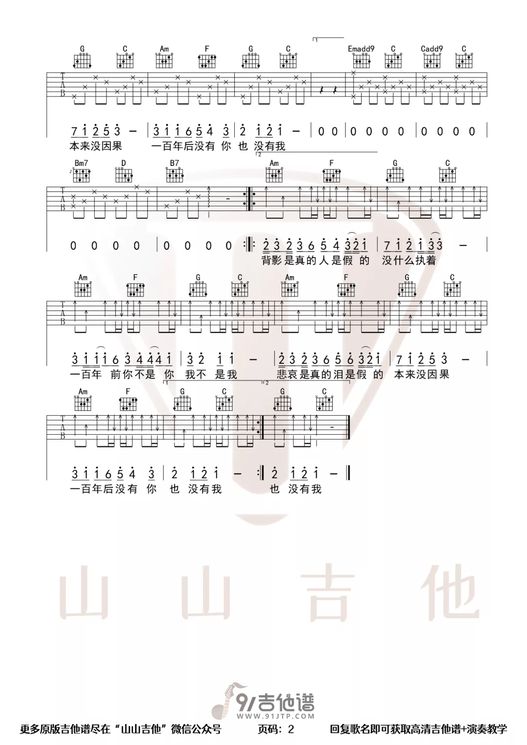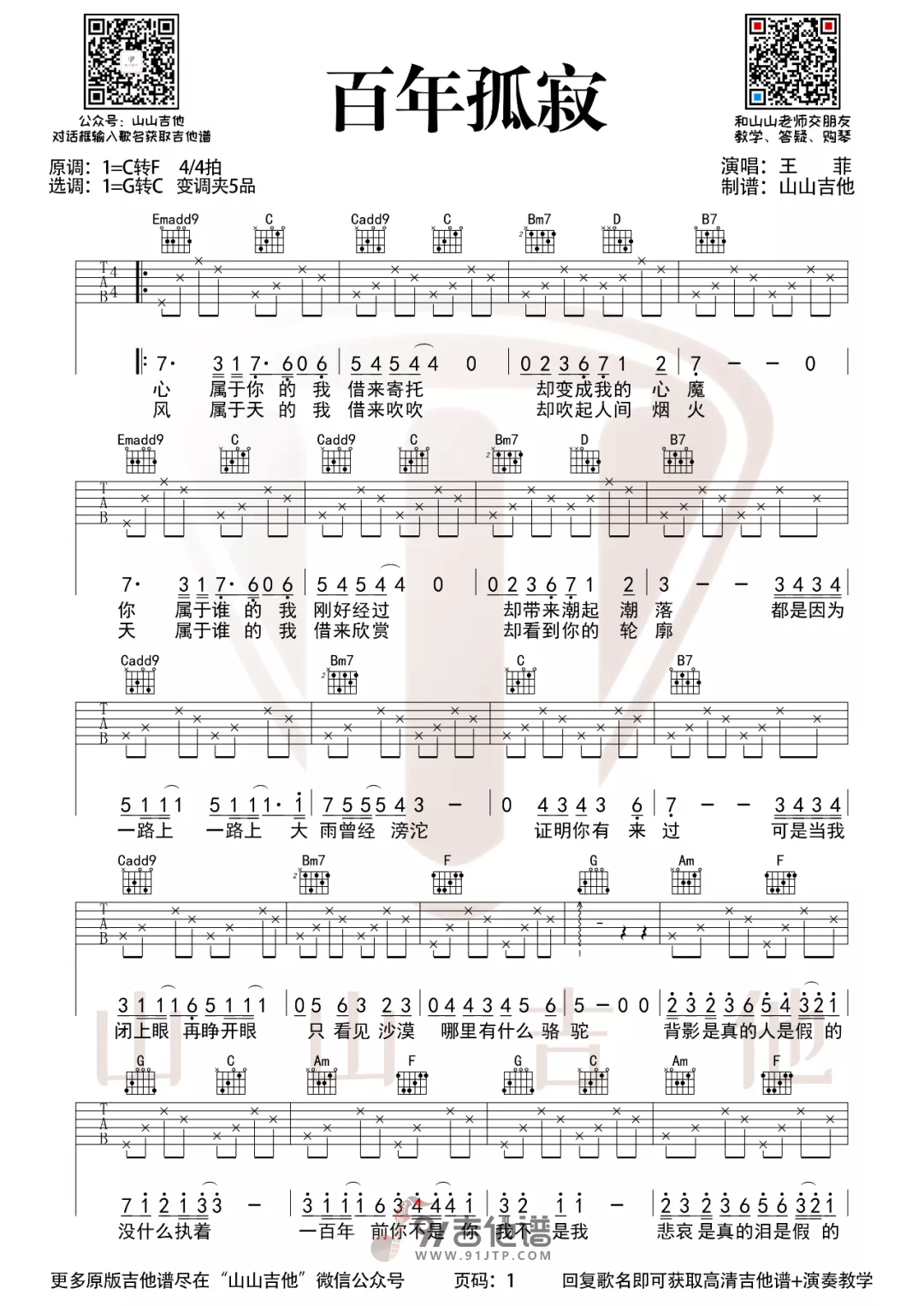曲谱介绍: 《百年孤寂》吉他谱分享,《百年孤寂》是由林夕作词、王菲演唱的歌曲,这首歌粤语版为《守望麦田》,发行时间在1999年,已经非常久远了。歌曲在编配上有着浓郁的中东色彩,歌词中的后一段词写得尤为气势磅礴,非林夕不能作。王菲把这首歌唱得气势磅礴,跌宕起伏、十分大气,显示出了她超强的歌曲驾驽能力。