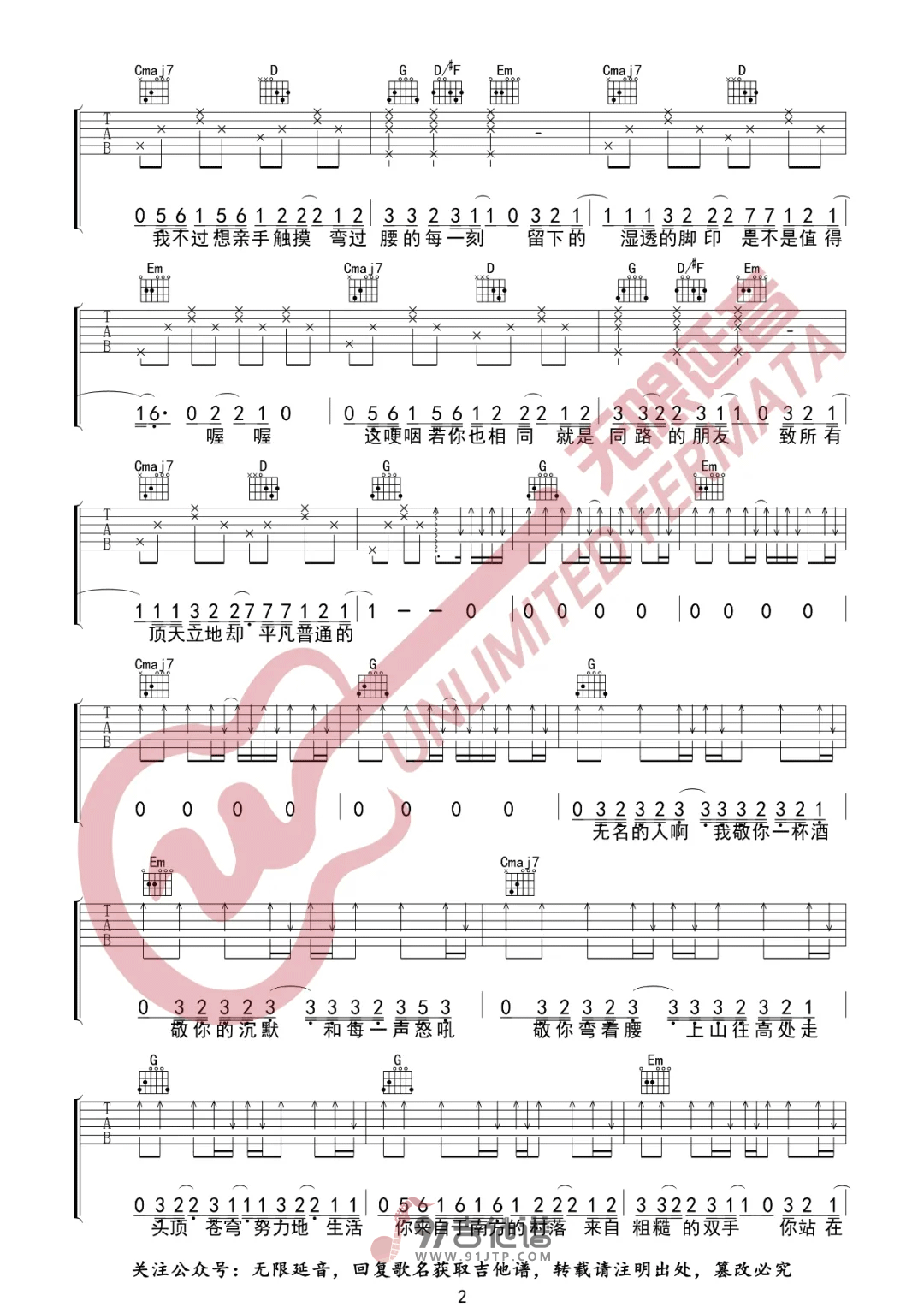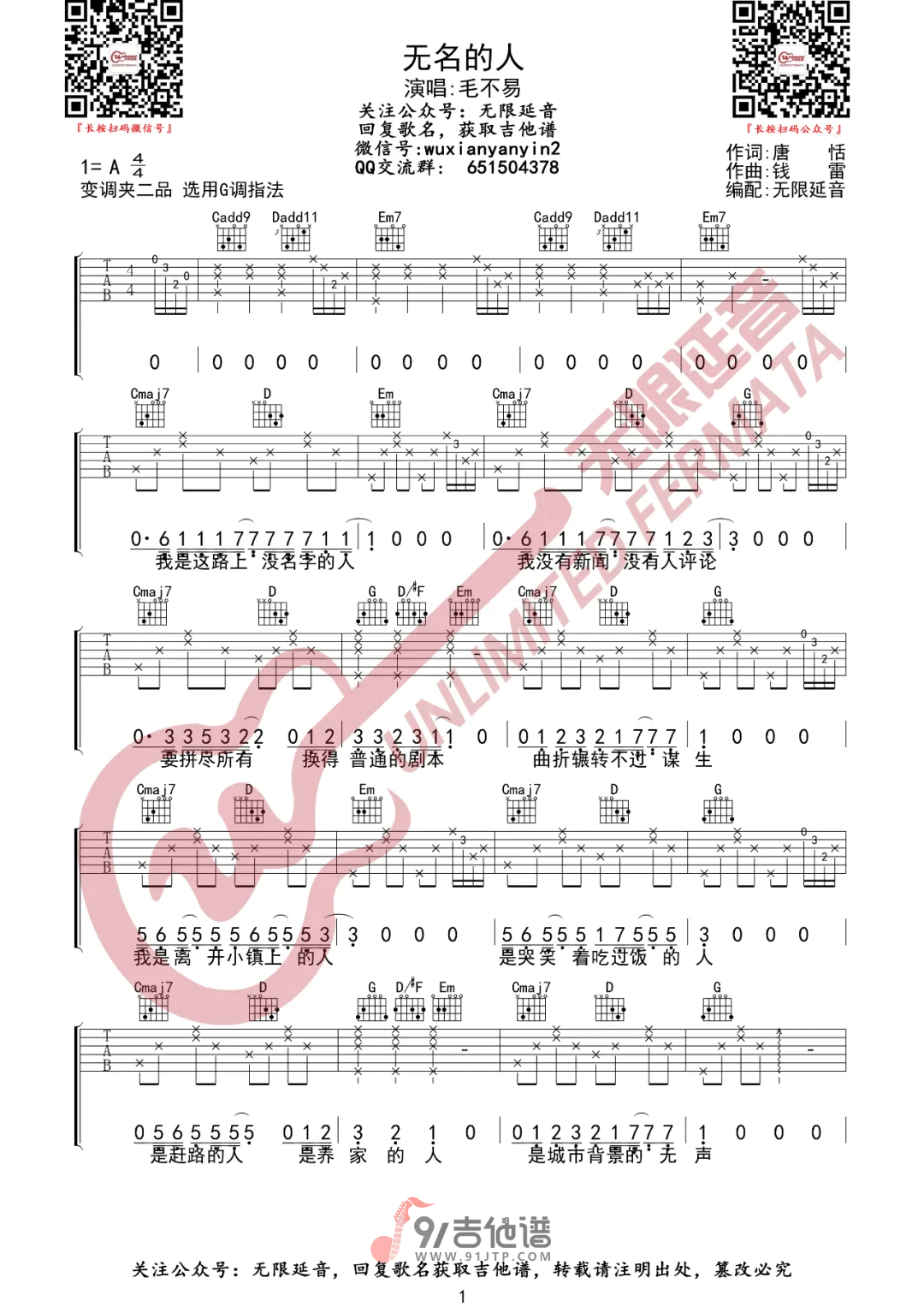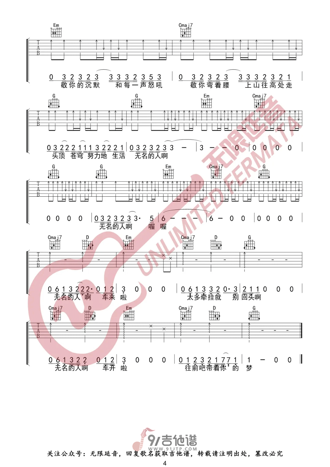 曲谱介绍: 曲谱简介:《无名的人》吉他谱 毛不易,《无名的人》是由毛不易演唱的一首最新歌曲,是电影《雄狮少年》的主题曲。毛不易的声音配上电影里阿娟的画面,简直是双重催泪buff!