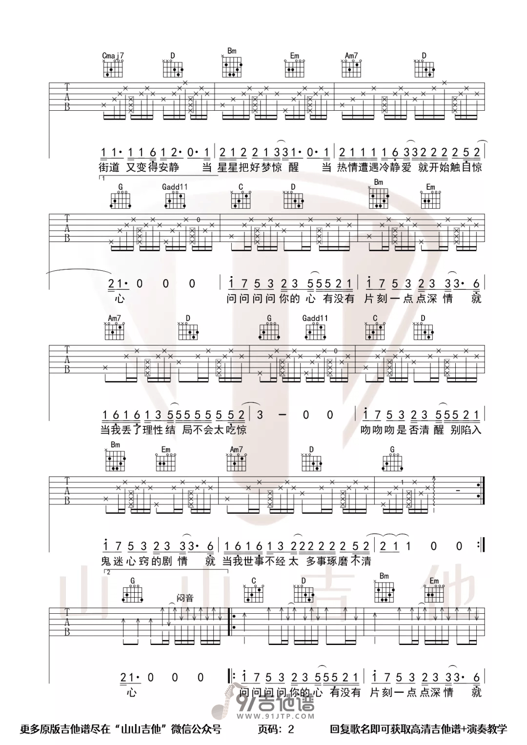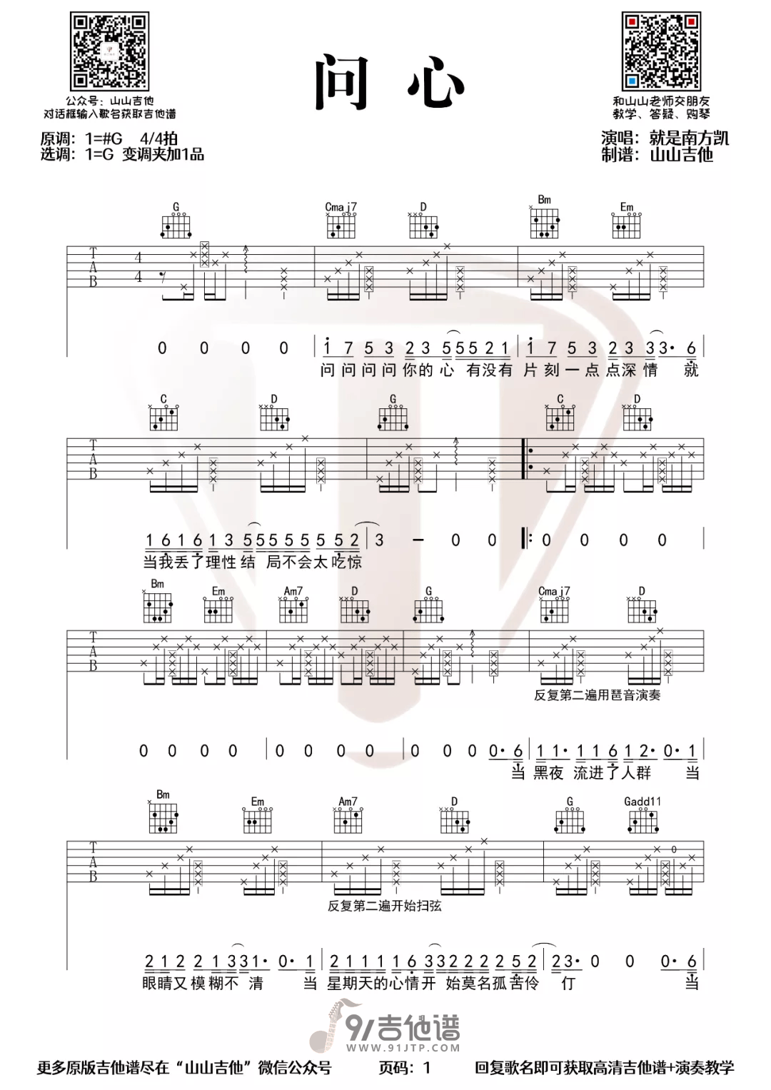 曲谱介绍: 曲谱简介:《问心》吉他谱,《问心》是由就是南方凯演唱的一首歌,这首歌是一首网络热门歌曲,最近热度比较高的一首歌。问问问问你的心,“有没有片刻一点点深情,就当我丢了理性,结局不会太吃惊”,歌曲原调为#G,这里采用G调指法编配,全曲主要运用的技巧就是拍弦技巧,需要琴友们自己多熟练一下。