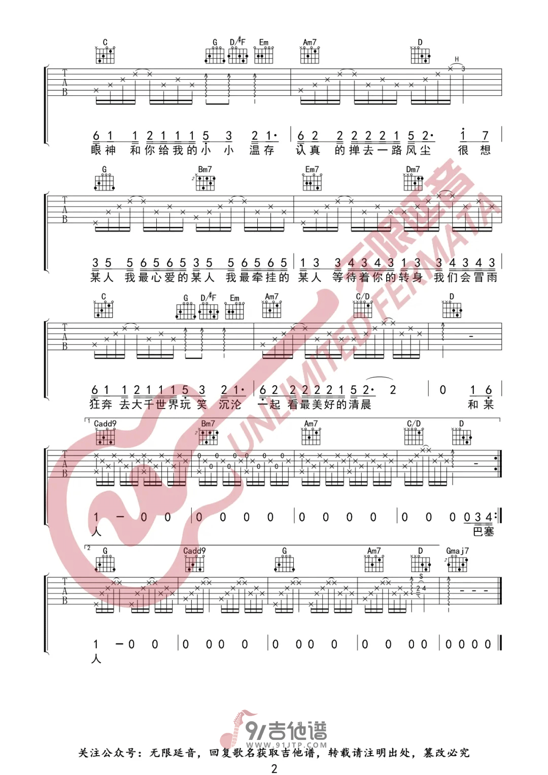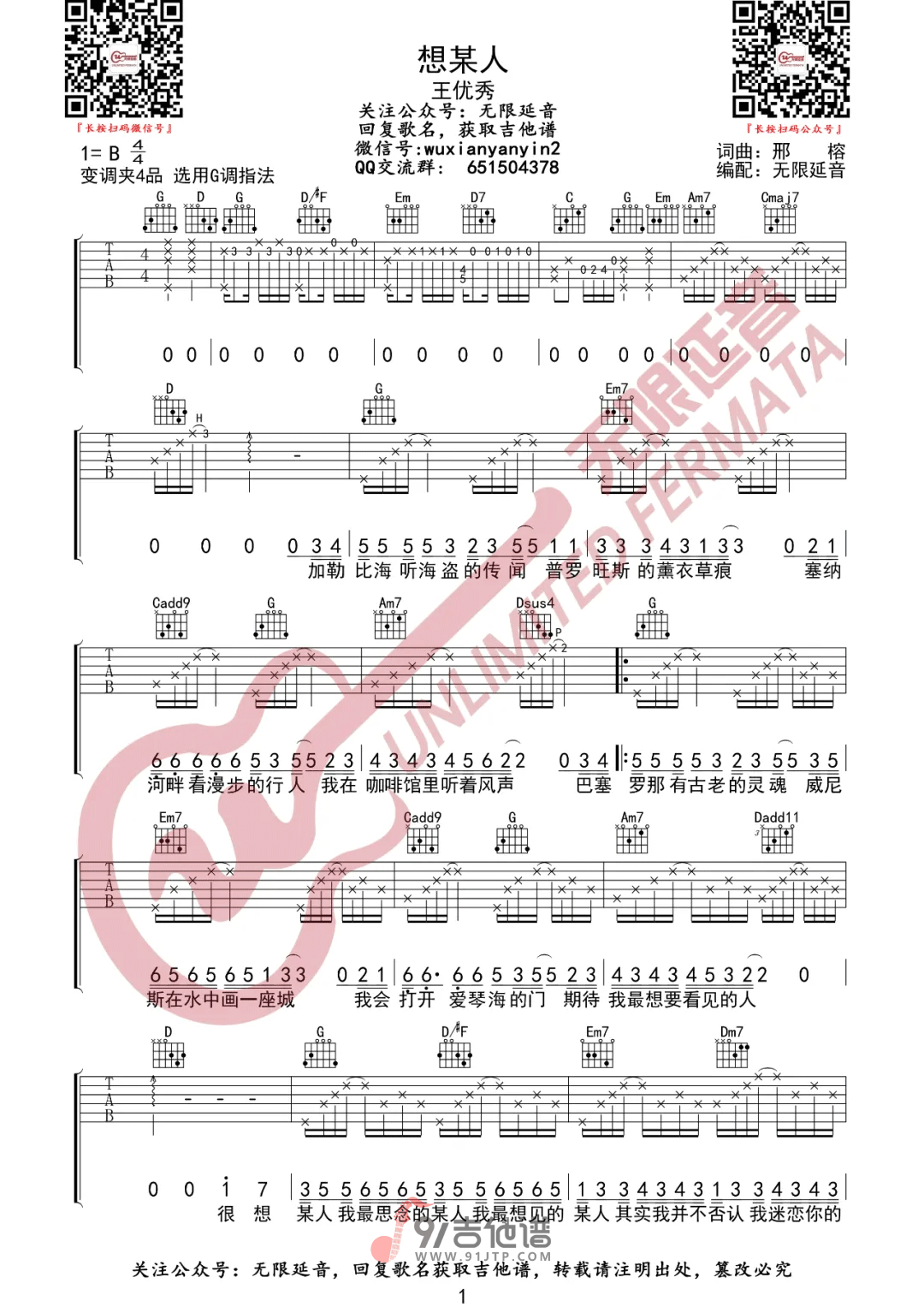 曲谱介绍: 曲谱简介:想某人吉他谱 王优秀,《想某人》是由王优秀演唱的一首网络热门歌曲,这首歌原唱其实是原唱是白嘉峻。对某人的思念总是会在不经意间的想起,看遍世界最好的风景,就是身边有你。歌曲表达的也就是一个人在外孤独的旅行着,去加勒比海听海盗传奇,到普罗旺斯闻薰衣草香,在塞纳河畔看人来人往;见巴塞罗那的古老灵魂,踱威尼斯城的每寸土地,听爱琴海岸的悠扬琴声。