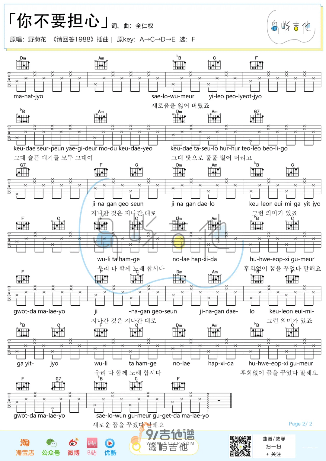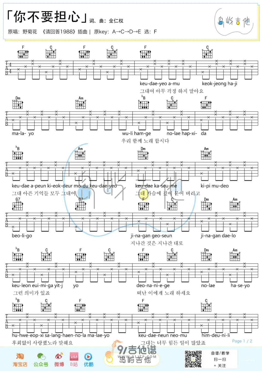 曲谱介绍: 曲谱简介:《你不要担心》吉他谱,《你不要担心》是由野菊花乐队演唱的一首歌曲,是电视剧《请回答1988》的插曲。每当剧里有心酸感人的画面,总会响起这首歌的旋律,作为主题曲这首歌承载了《请回答1988》里的很多感动时刻,每次听到这首歌都会鼻酸...人生就像这部剧一样,每个人都能找到自己的影子。或好或坏,一句“你不要担心”就掩盖过去。
