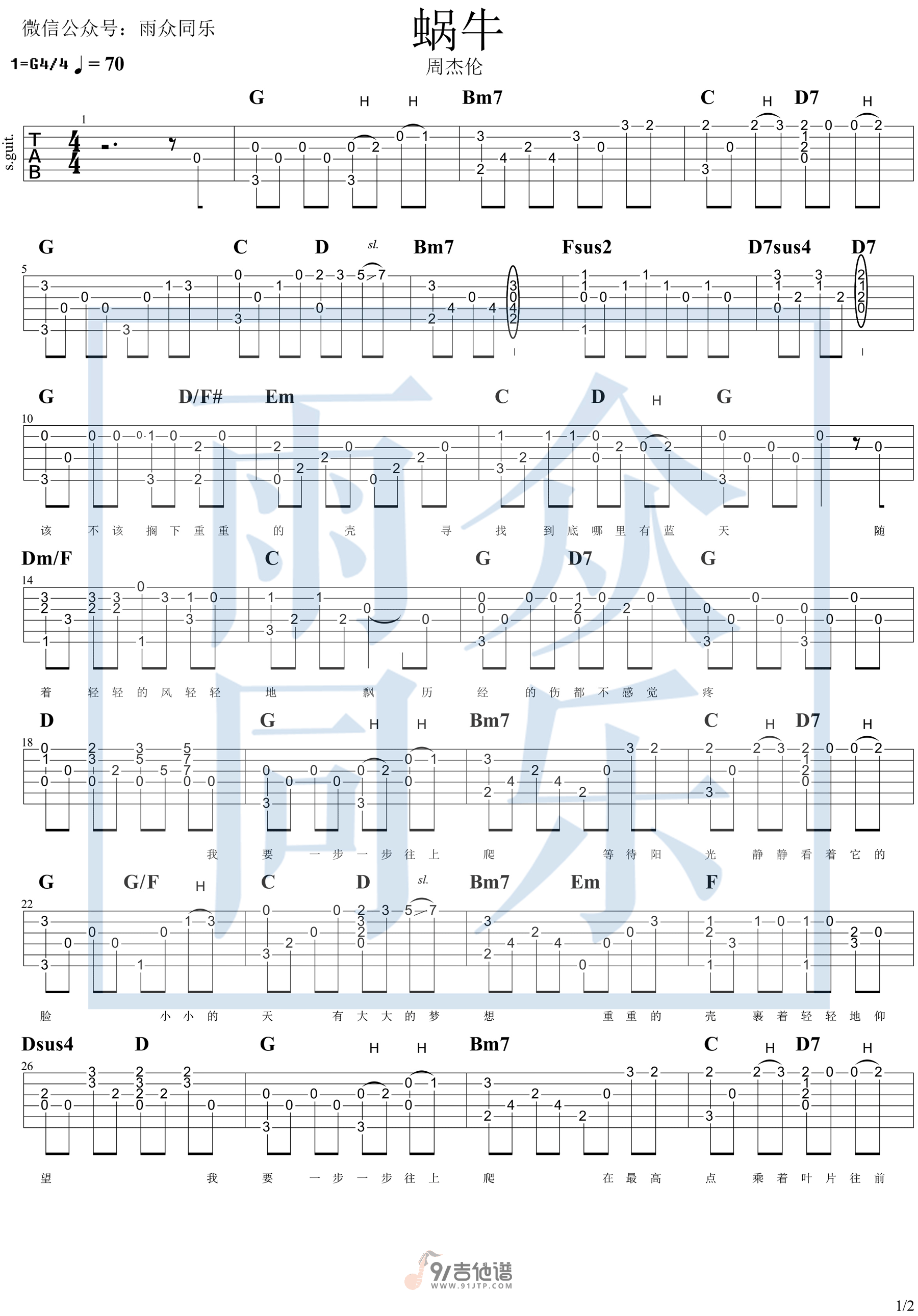 曲谱介绍: 曲谱简介:蜗牛指弹吉他谱指弹独奏六线谱,《蜗牛》是由杰伦创作并演唱的一首非常励志的歌曲,你是否还记得周杰伦演唱会上大喊“杰伦加油”的一幕?这首歌曲虽然是杰伦写给他人的,但却是自己的故事。可以说这首歌曲陪伴了许多90后的中学时代,每当晚上熬夜学习的时候,坚持不下去了就听这首《蜗牛》。你会不会也在感到疲惫气馁的时候,回放这首歌曲?