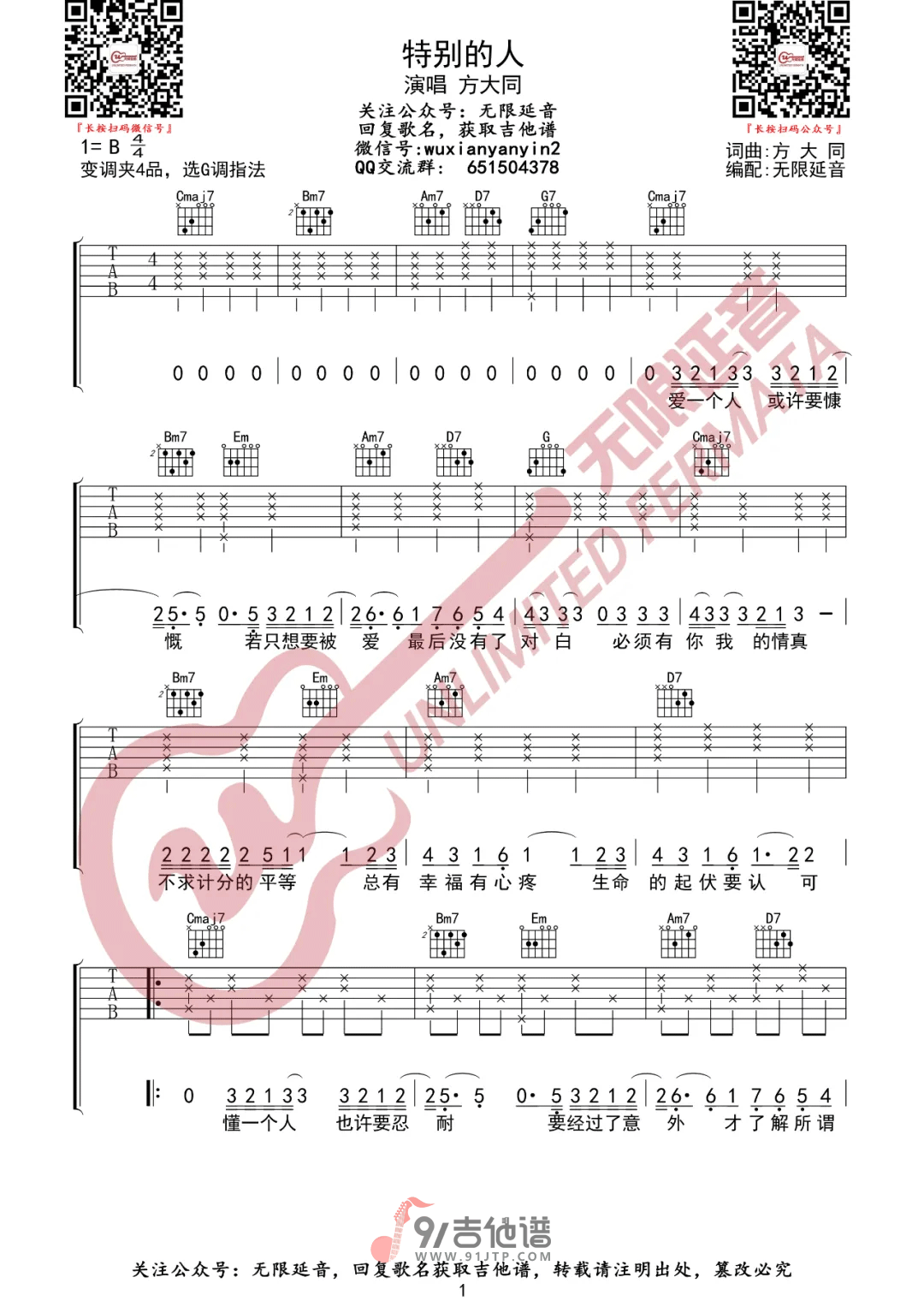 曲谱介绍: 曲谱简介:特别的人吉他谱,《特别的人》是由方大同作词、作曲并演唱的一首歌曲,这首歌是一首以弦乐及缓拍琴声为主的情歌,一首会在心底不断回荡的旋律。歌曲表达了每个人在生命之中,都在等待一个特别的人,我们总是要在了解了爱与被爱之后,才能清楚看见那个完整自己的人。歌曲原调为B调,这里采用了G调指法进行编配,演唱时夹变调夹4品可回到原调。