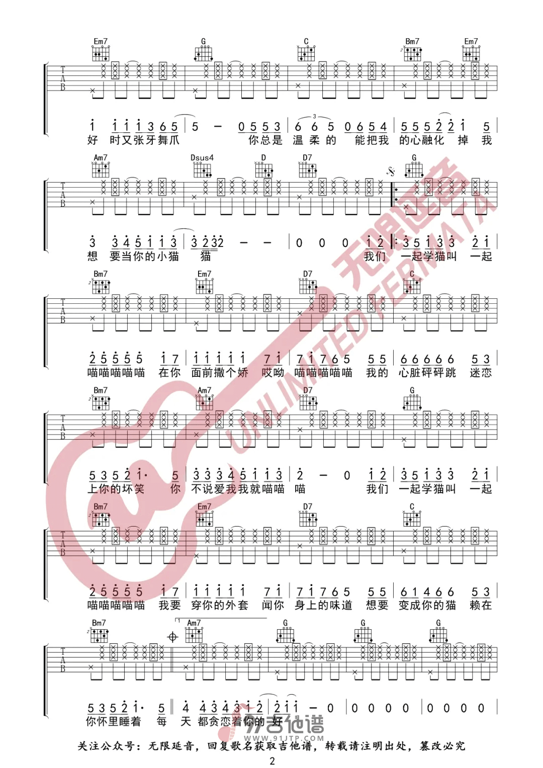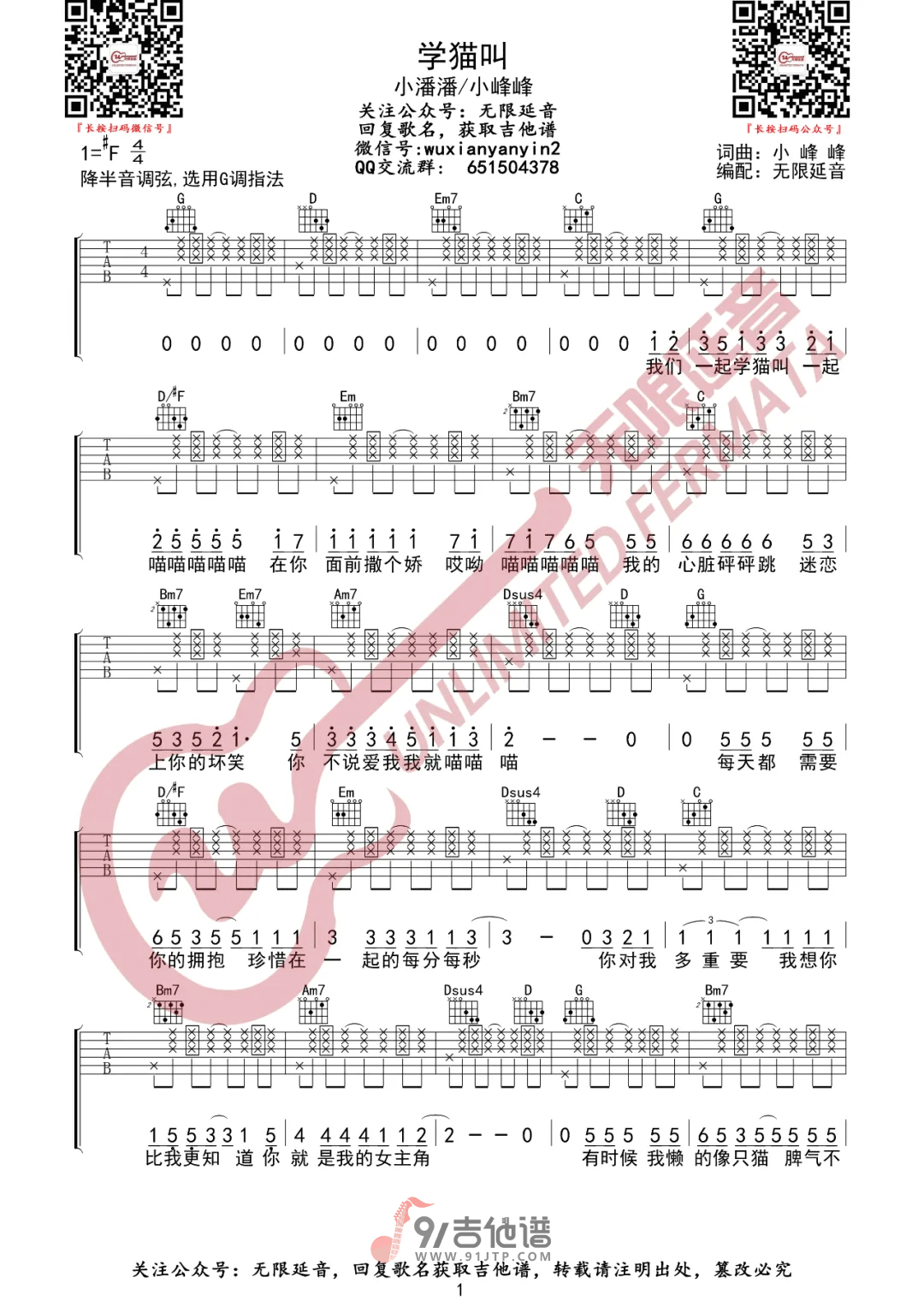 曲谱介绍: 曲谱简介:《学猫叫》吉他谱,《学猫叫》这首歌是由小峰峰创作,并与小潘潘一起合唱的歌曲,小潘潘又甜又清爽的嗓音,犹如炎炎夏日的第一口冰激凌,与小峰峰温柔的男声碰撞在一起,搭配成和谐的男女对唱。歌曲不仅是一首小情歌,更是情侣之间美好的恋爱状态,从初遇的羞涩、任性的包容到陪伴的告白。虽然该曲的歌词和旋律,都很简洁,但是铺面而来的少女纯爱气息,让人尝到青春的味道。