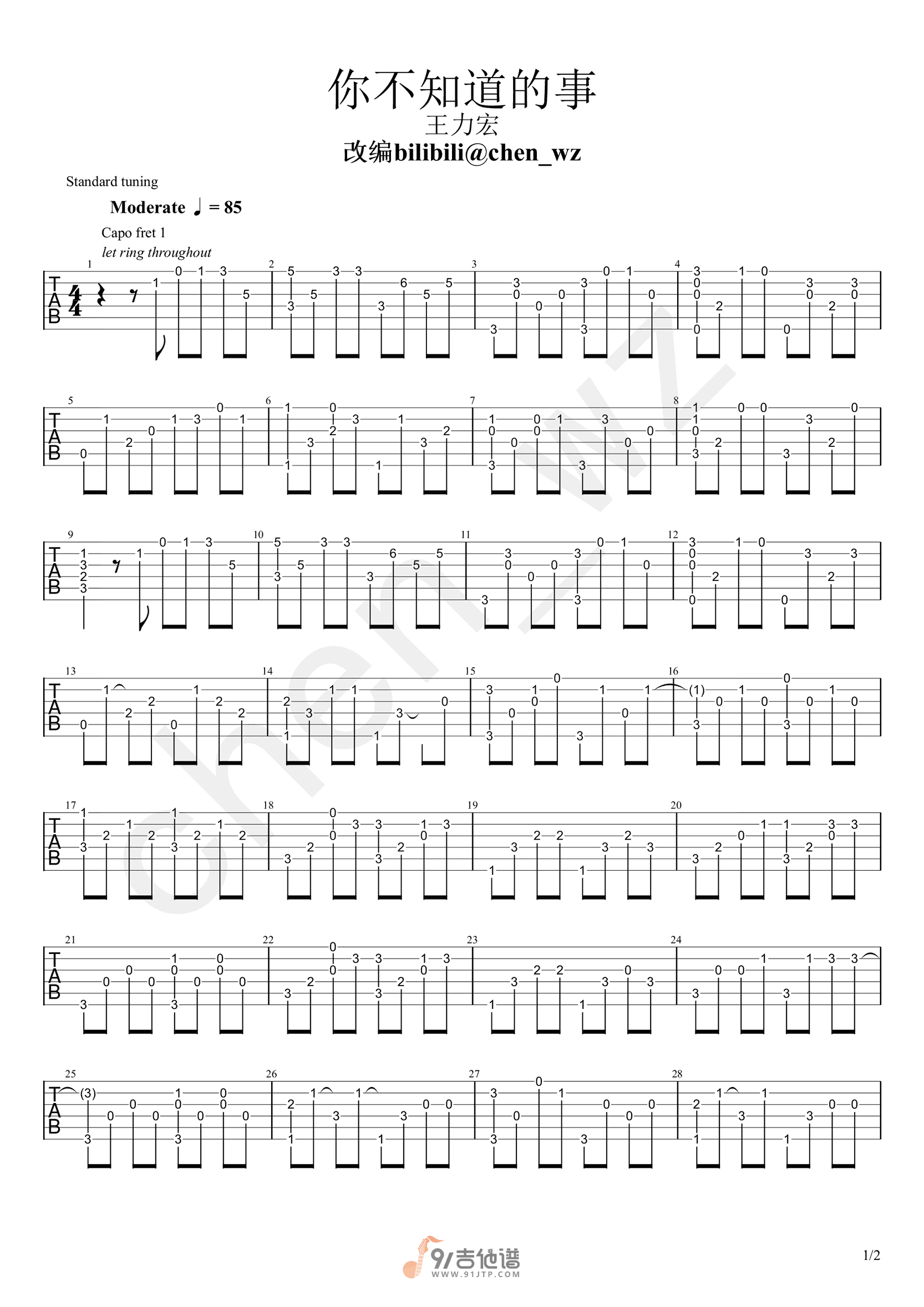 曲谱介绍: 曲谱简介:《你不知道的事》指弹吉他谱 王力宏吉他独奏六线谱,《你不知道的事》是由王力宏演唱的一首歌曲,由王力宏、瑞业作词,王力宏作曲,歌曲也是电影《恋爱通告》的主题曲。这首歌是KTV必点曲目,这里是根据原曲改编的指弹吉他版本,指法比较简单,另外附上谱子的示范视频,有不懂的地方,可以参考一下视频练习。