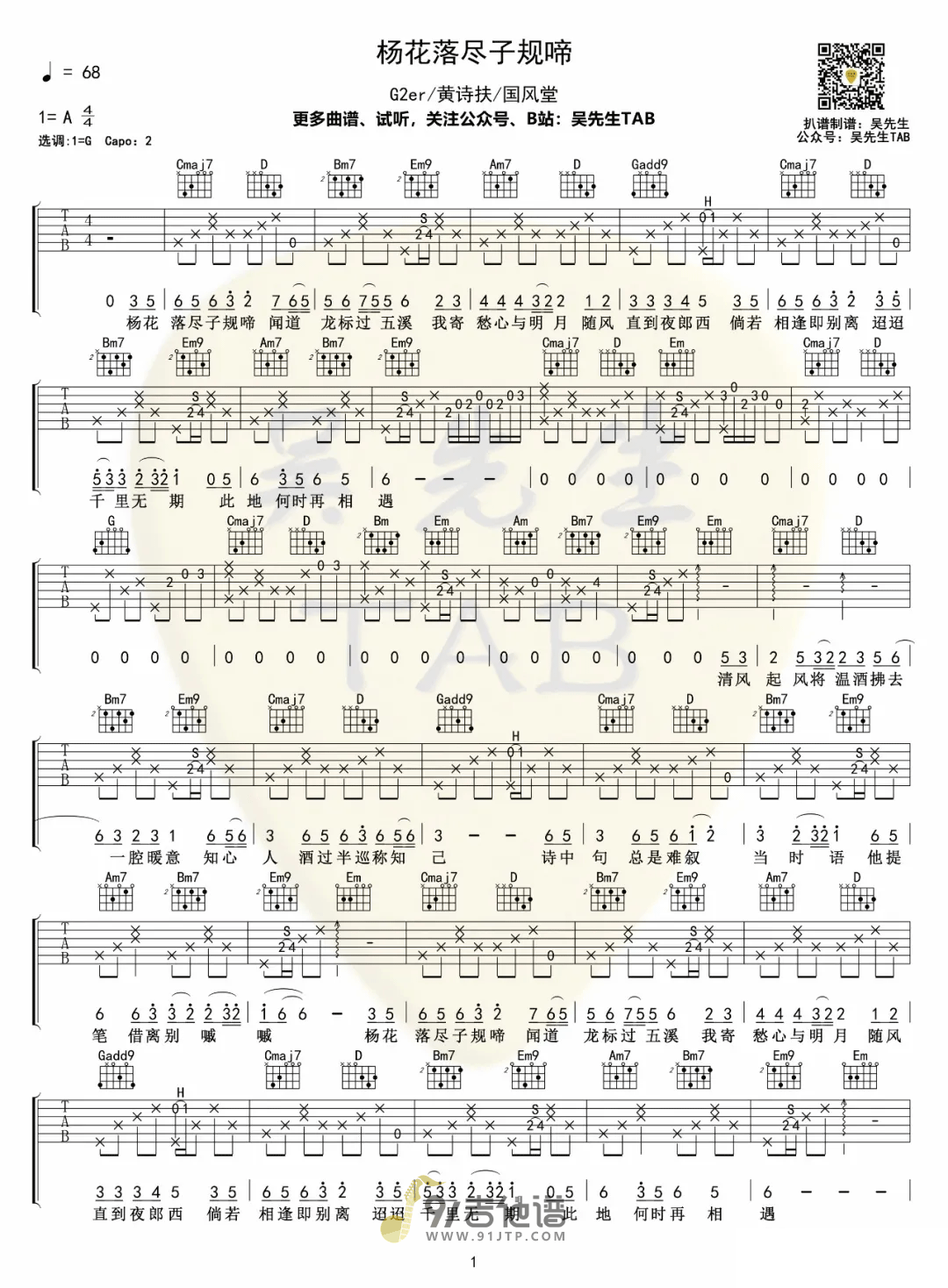 曲谱介绍: 曲谱简介:《杨花落尽子规啼》吉他谱 黄诗扶,《杨花落尽子规啼》是由国风堂、G2er和黄诗扶演唱的一首古风歌曲,千里可共,月明中天,我心昭昭向明月。