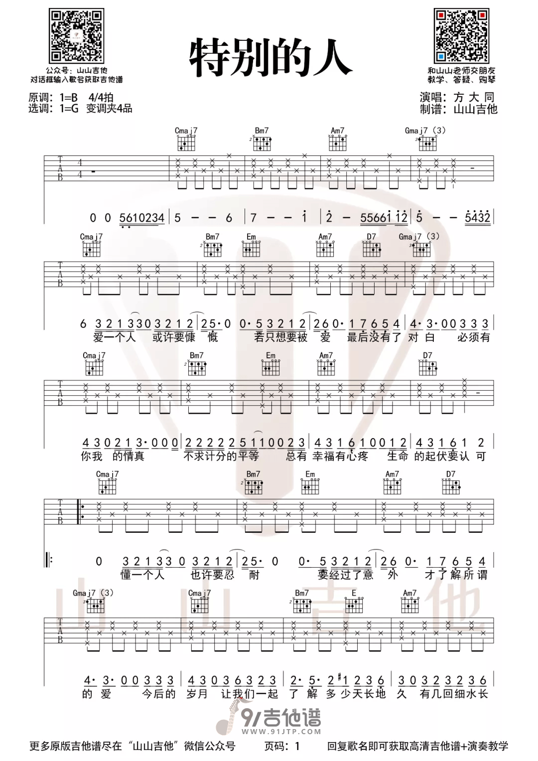 曲谱介绍: 曲谱简介:《特别的人》吉他谱 方大同,《特别的人》是方大同创作并演唱的一首情歌,“我们是对方,特别的人”,这首歌的创作背景是方大同在写完这首歌之后觉得某歌手非常适合,也将这首歌转给的对方的工作团队,但方大同之后却越听越觉得可惜,幸好对方工作团队表示收歌阶段已经结束这首歌并没有用上,这才让方大同有机会重新唱回这首歌。