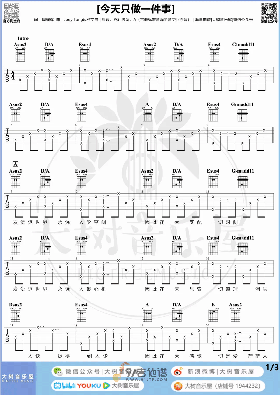 曲谱介绍: 曲谱简介:《今天只做一件事》吉他谱 陈奕迅 吉他弹唱教学,《今天只做一件事》是由陈奕迅演唱的一首粤语歌曲,整首歌曲都有和音伴随,又有流水声,是十分柔和轻快的歌曲