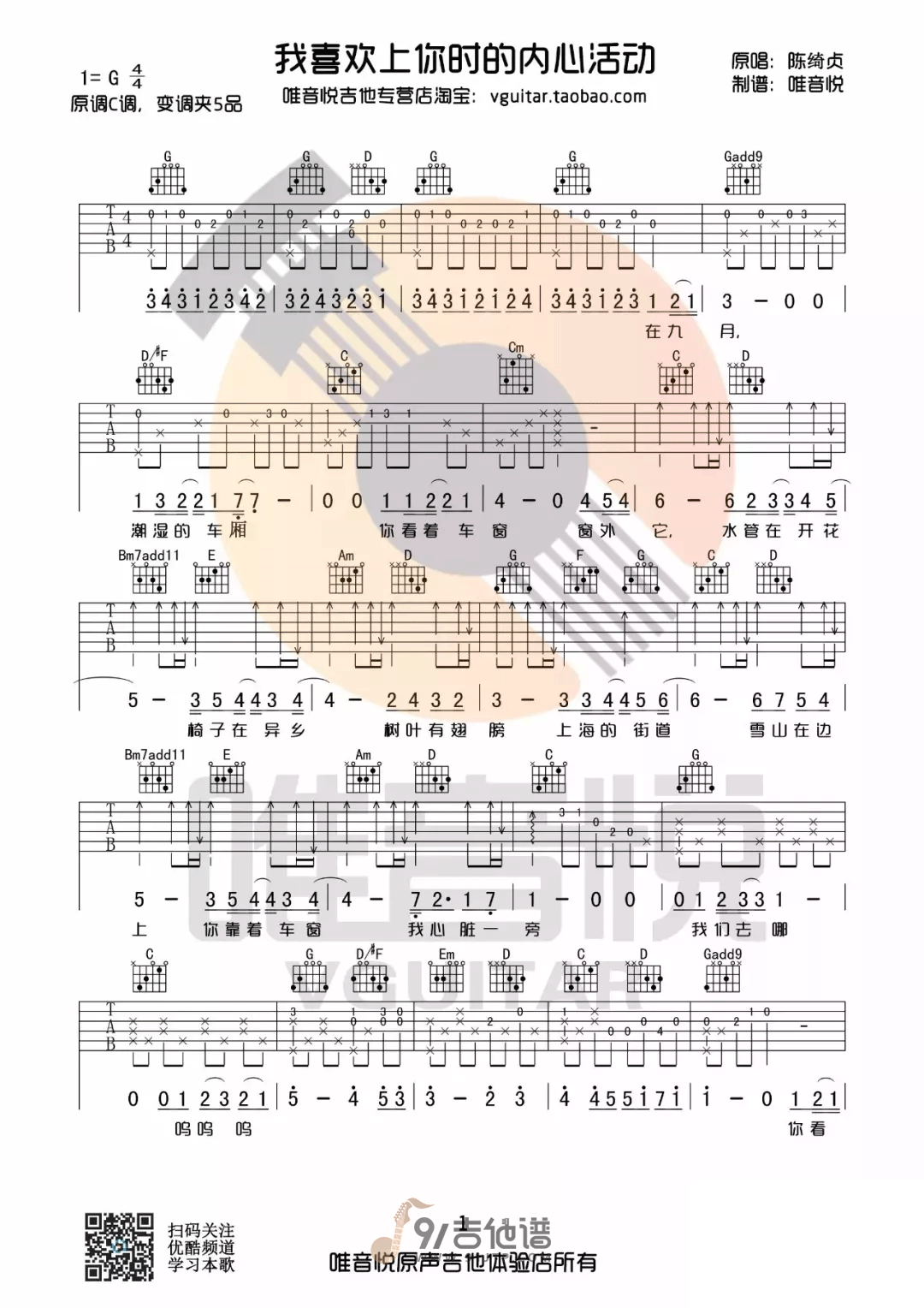 曲谱介绍: 曲谱简介:《我喜欢上你时的内心活动》吉他谱 陈绮贞吉他谱,《我喜欢上你时的内心活动》是由韩寒填词陈绮贞演唱的歌曲,作为电影《喜欢你》的主题曲于发布。
