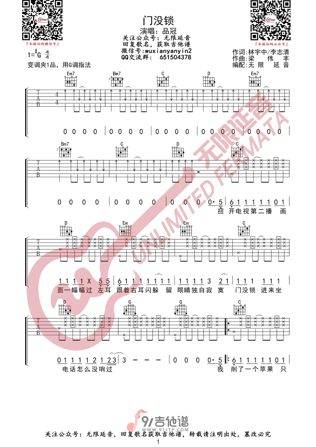 曲谱介绍: 曲谱简介:门没锁吉他谱 品冠,《门没锁》是品冠多年前的老歌,这首歌重新翻红,有很多要素加持。品冠儿子天赋异禀的话题,歌手与听众互动中出现的搞笑新梗,平台入场后的玩法迭代和流量助推,都是促成翻红的必要条件。歌曲原调为#G调,这里采用G调指法进行编配,歌曲本身不难,拍弦技巧掌握好,基本就掌握了这首歌。