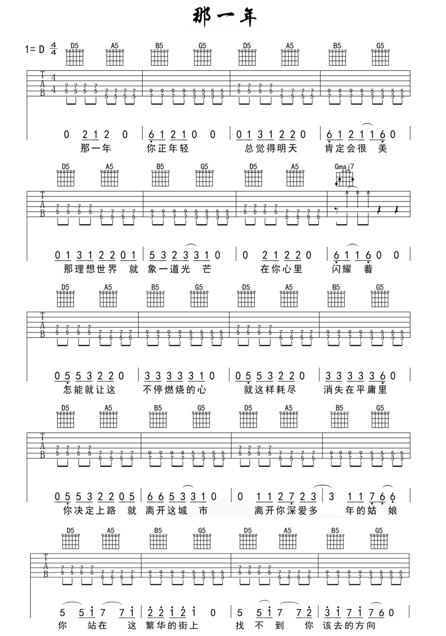 • 那一年吉他谱 - D调吉他弹唱谱第1张