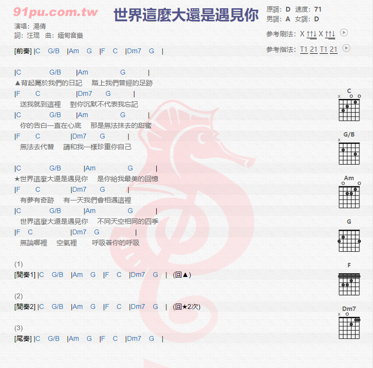 世界这么大还是遇见你吉他谱 - 汤倩 - D调吉他弹唱谱