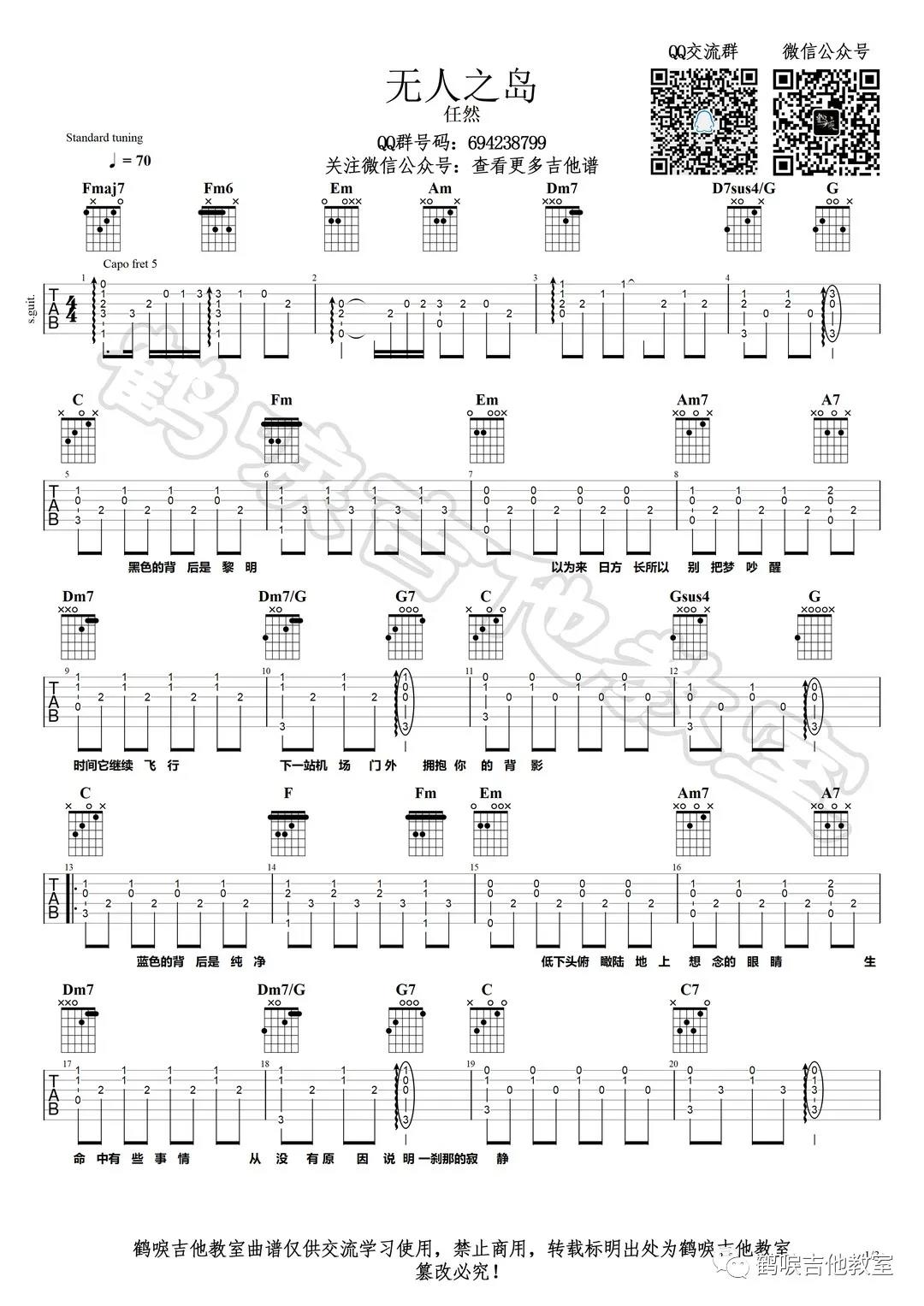 曲谱介绍: 任然《无人之岛》吉他弹唱谱,采用F调指法编配,共有3张高清图谱。