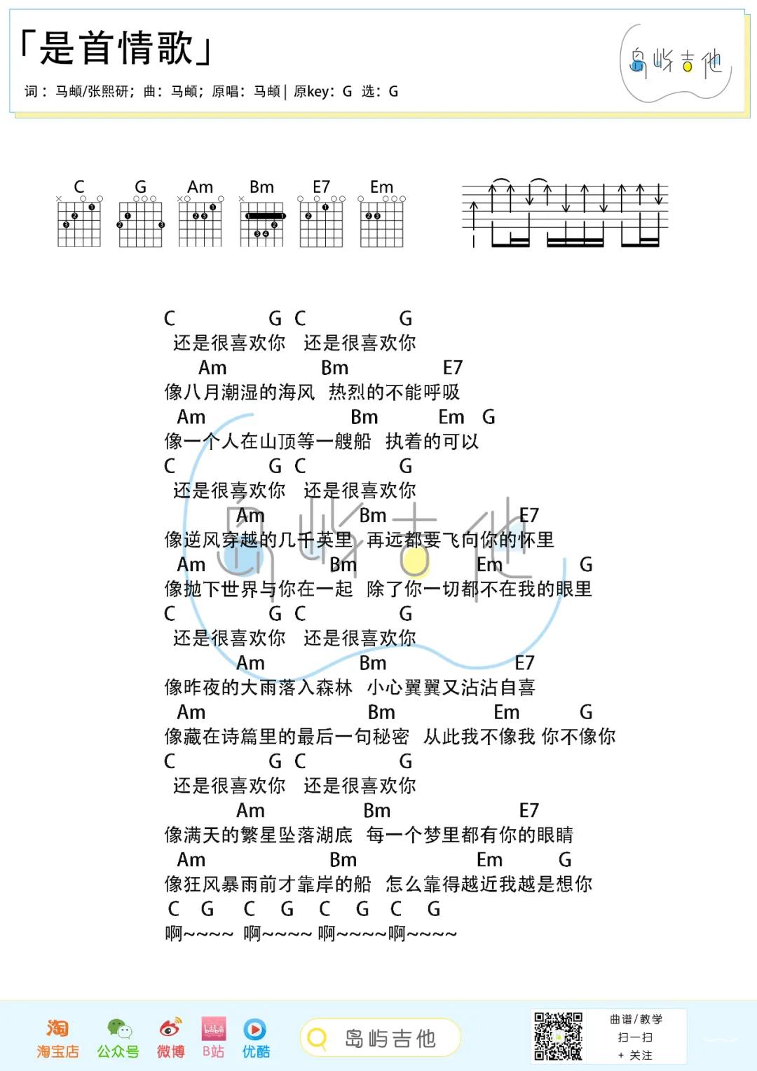 曲谱介绍: 马頔《是首情歌》吉他弹唱谱,采用G调指法编配,共有1张高清图谱,免翻页排版设计。