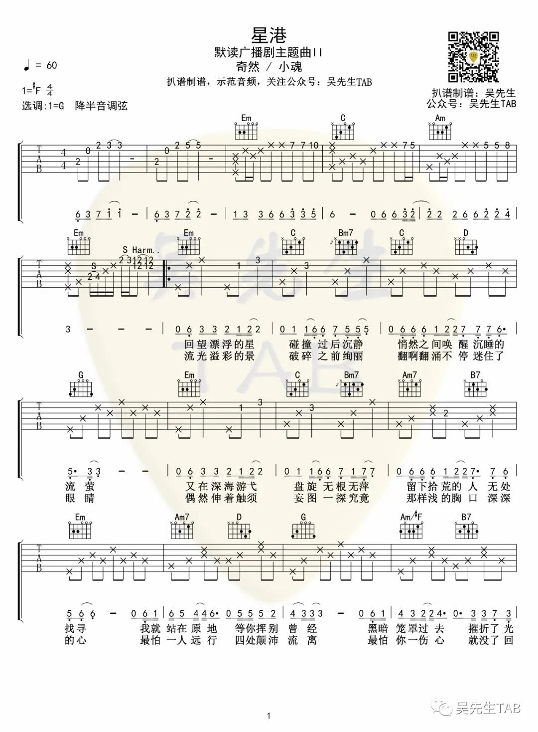 星港吉他谱 - 奇然,小魂 - G调吉他弹唱谱