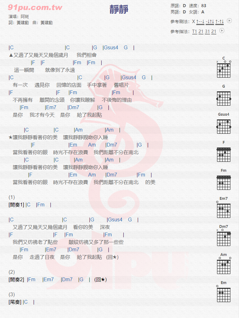 静静吉他谱 - 阿斑 - D调吉他弹唱谱