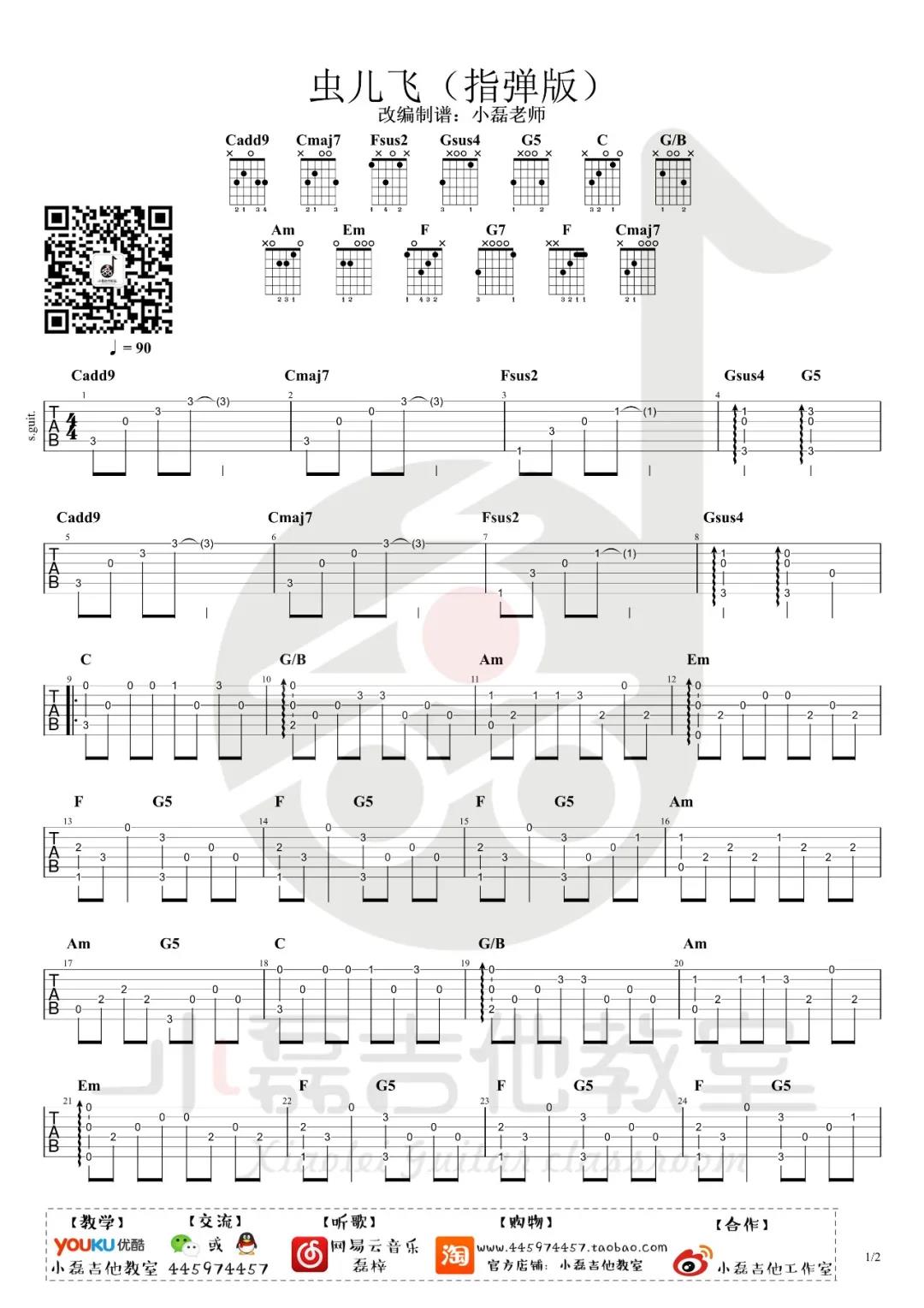 曲谱介绍: 儿童歌曲《虫儿飞()》吉他独奏谱,采用C调指法编配,共有2张高清图谱,免翻页排版设计。