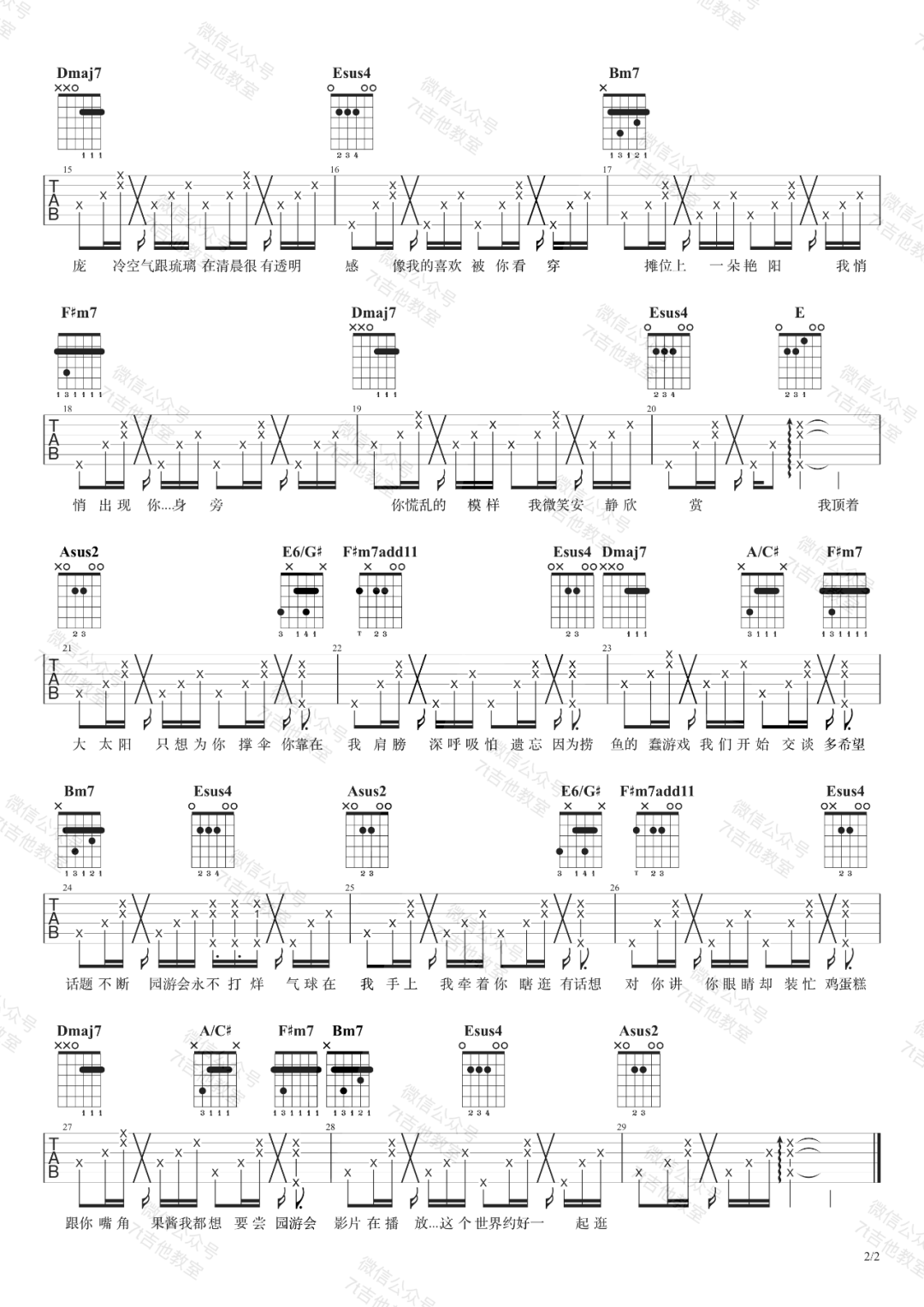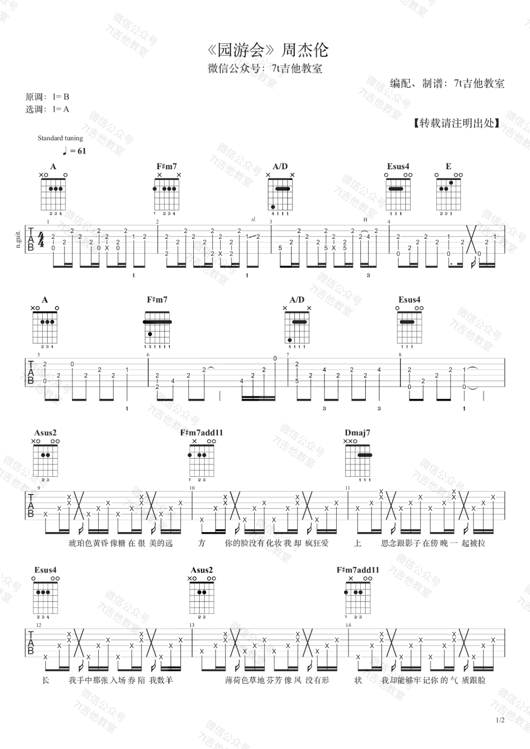 曲谱介绍: 周杰伦《园游会》吉他弹唱谱,采用A调指法编配,共有2张高清图谱,免翻页排版设计。