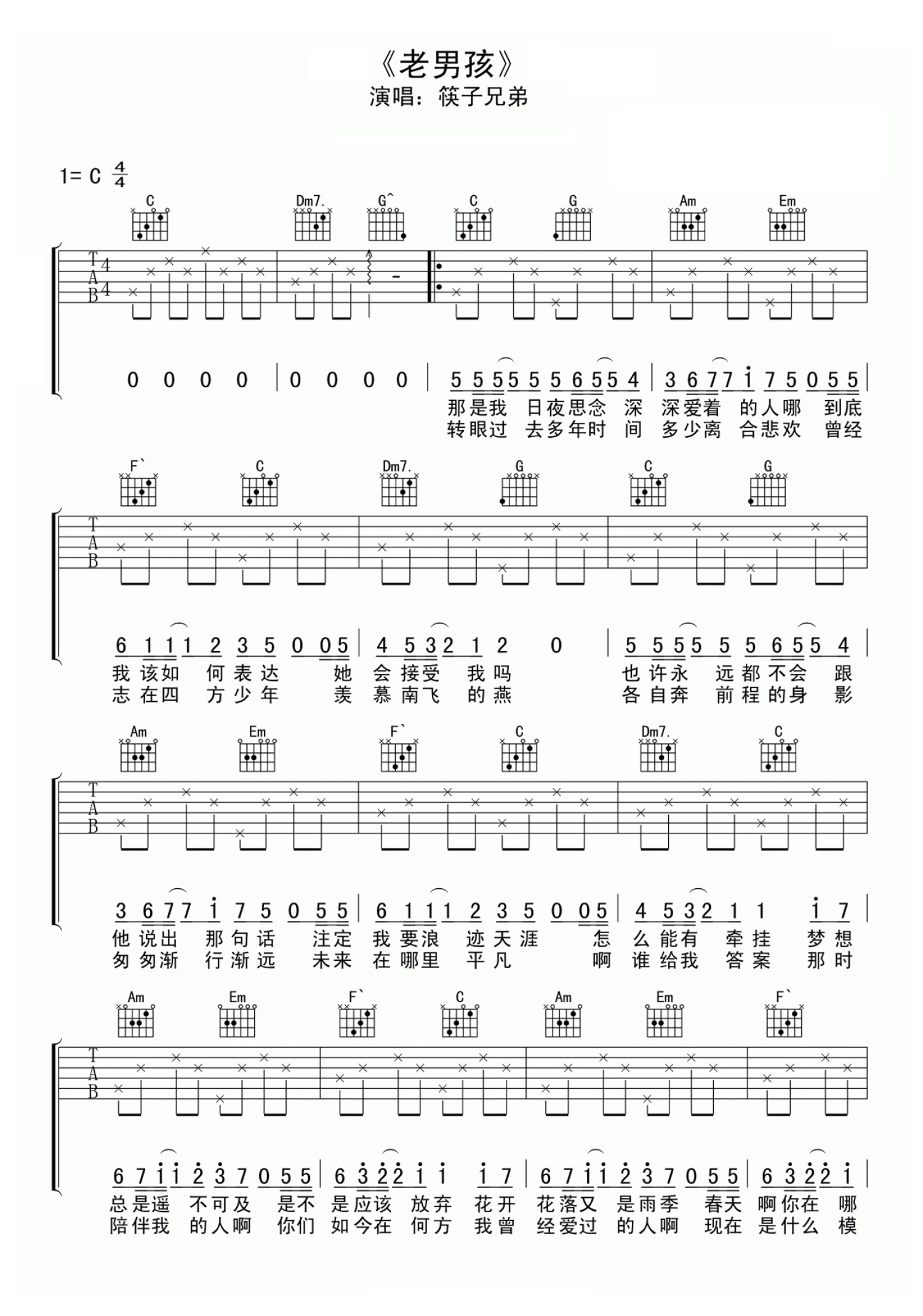 曲谱介绍: 筷子兄弟《老男孩》吉他谱_C调吉他弹唱谱_简单入门版