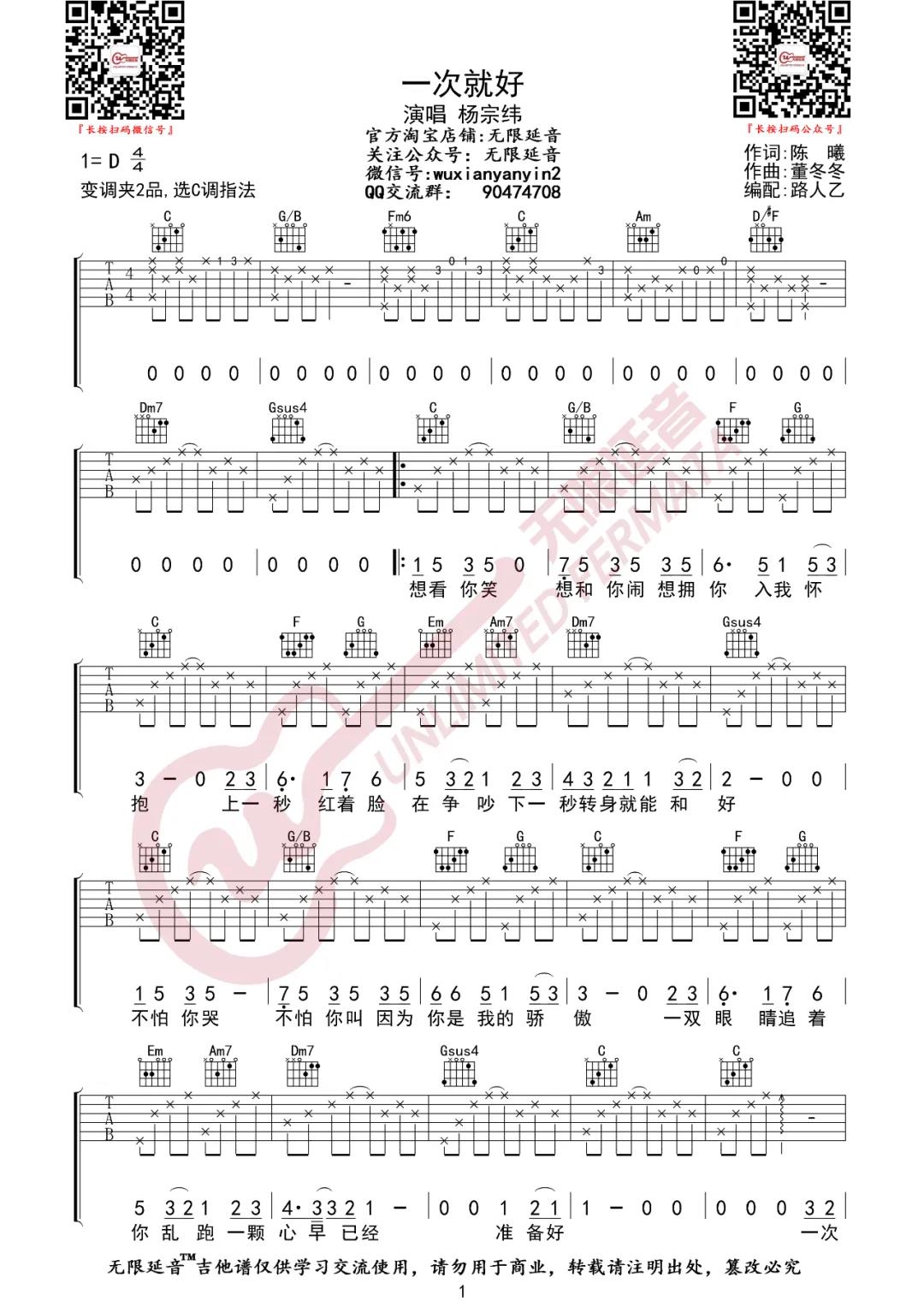 一次就好吉他谱 - 杨宗纬 - D调吉他弹唱谱