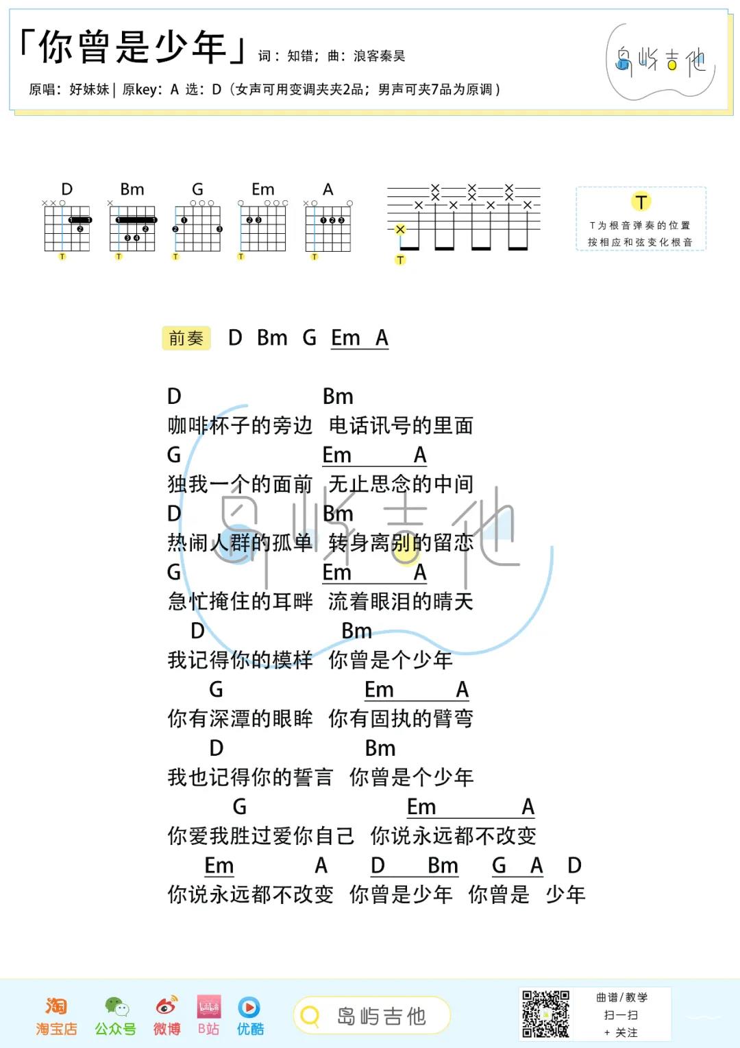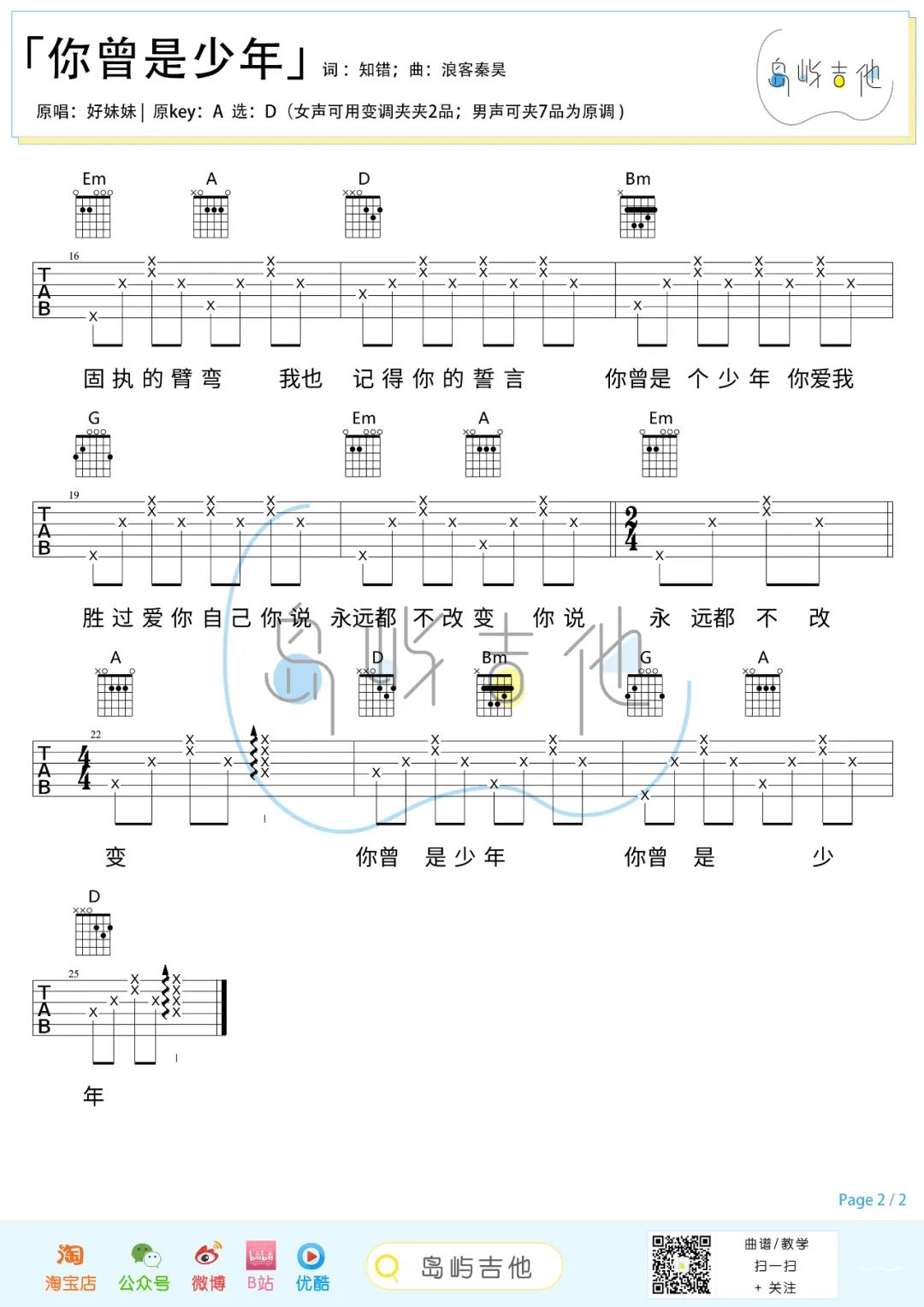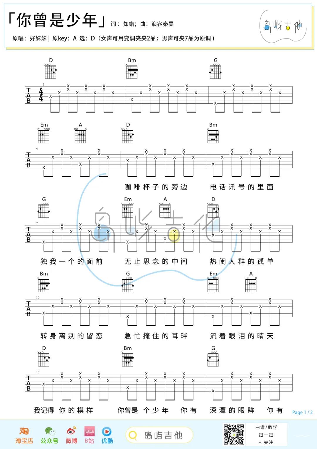 曲谱介绍: 好妹妹乐队《你曾是少年》吉他弹唱谱,采用D调指法编配,共有3张高清图谱。
