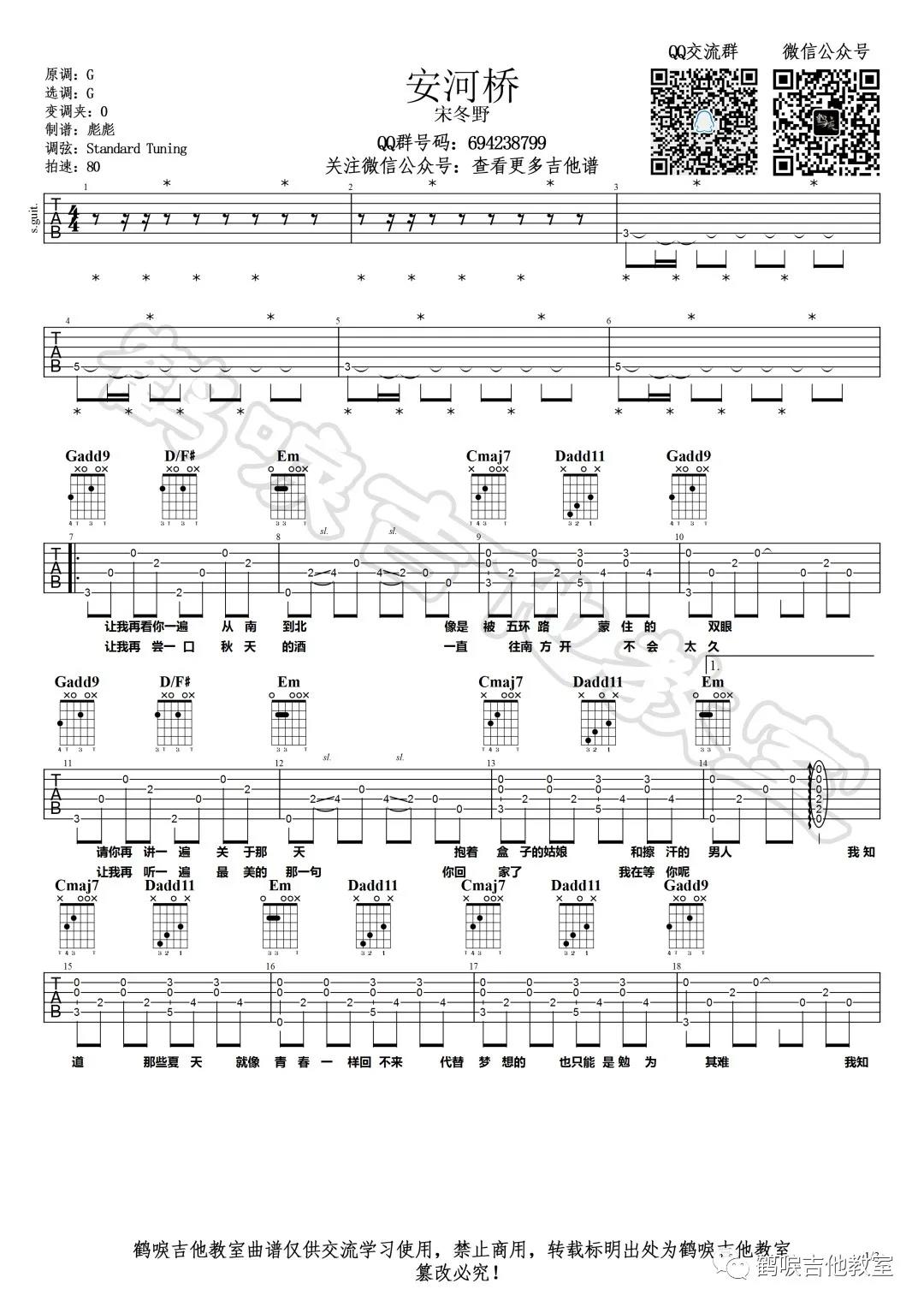 曲谱介绍: 宋冬野《安河桥》吉他弹唱谱,采用G调指法编配,共有3张高清图谱。