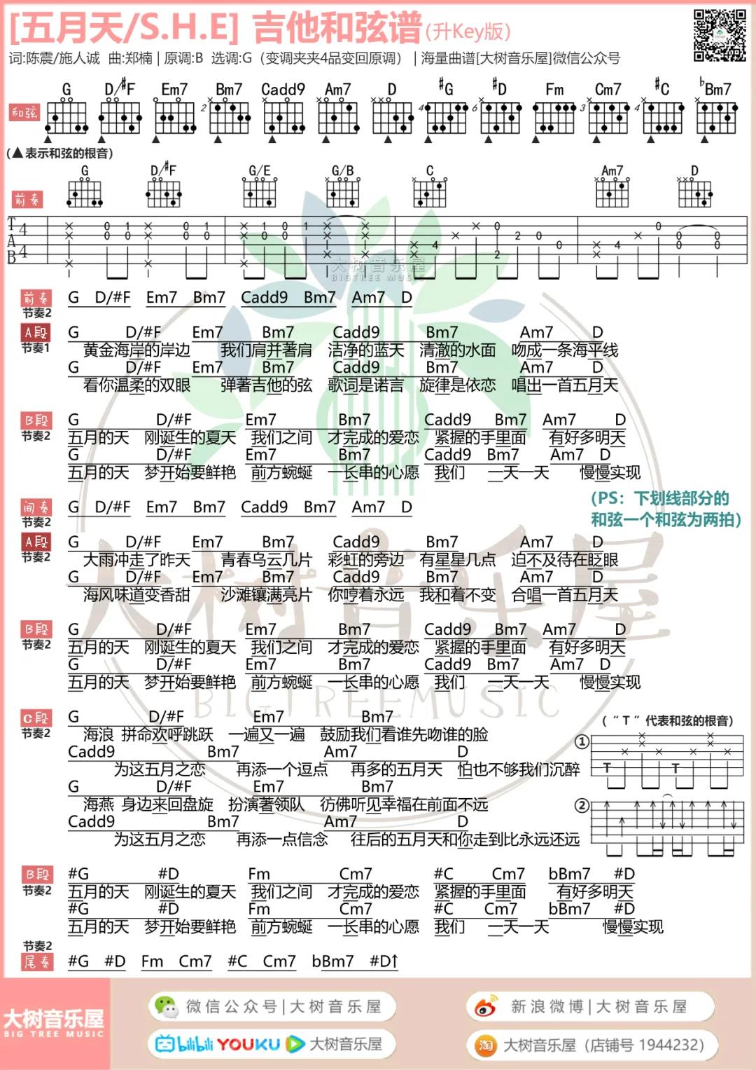 曲谱介绍: S.H.E《五月天》吉他弹唱谱,采用G调指法编配,共有1张高清图谱,免翻页排版设计。