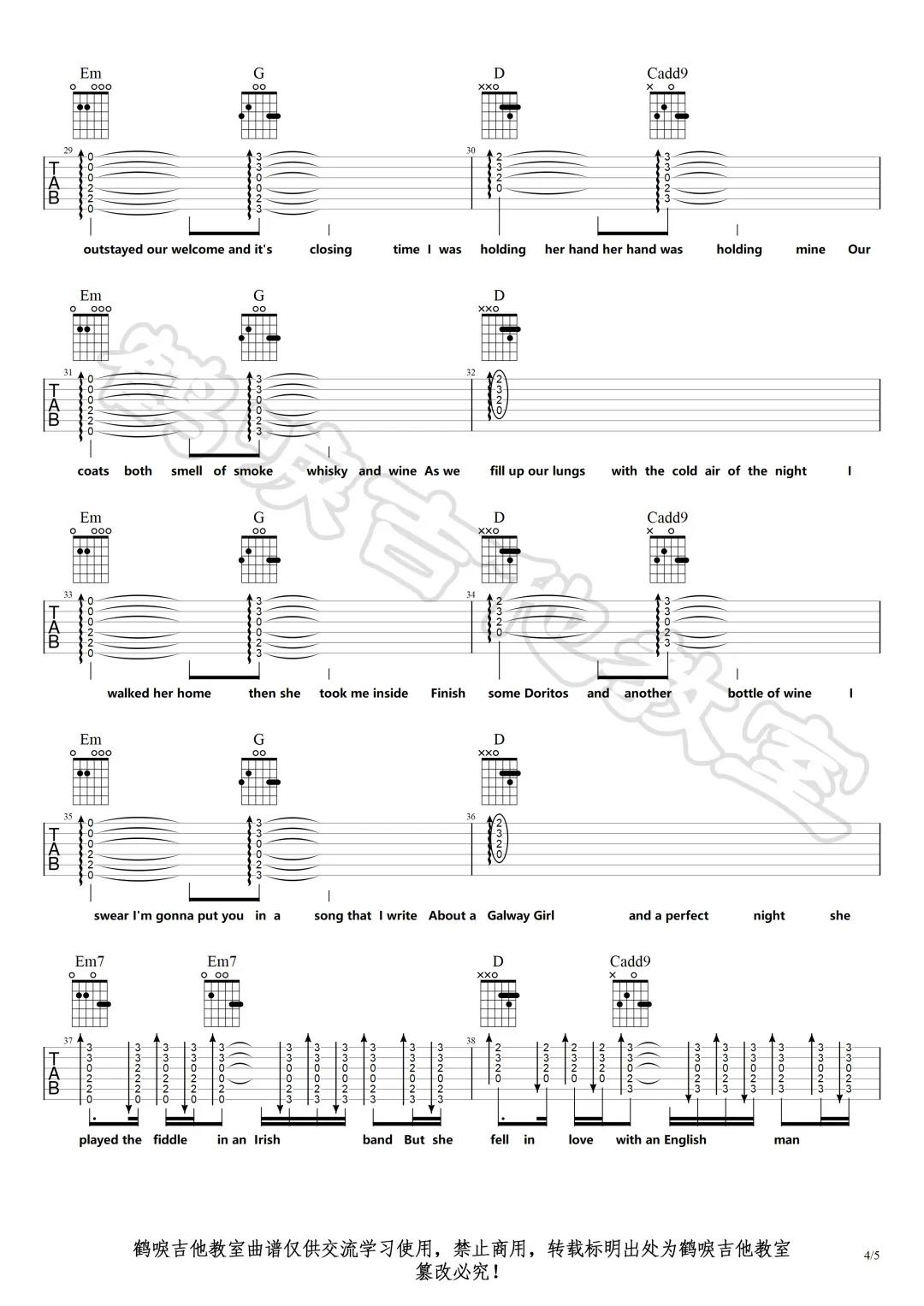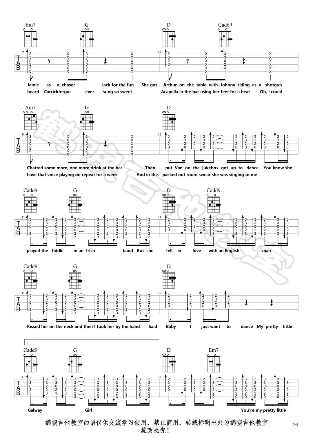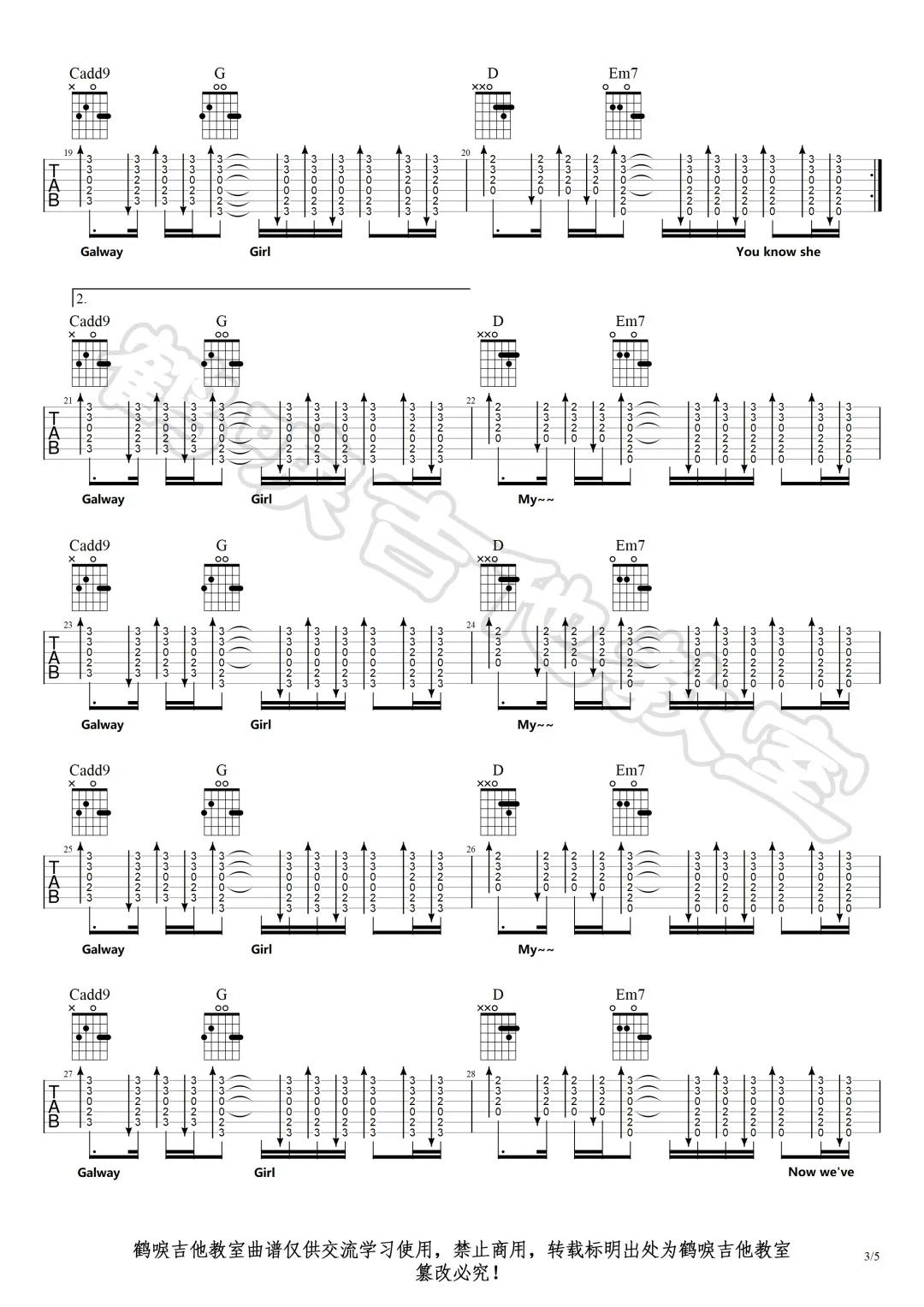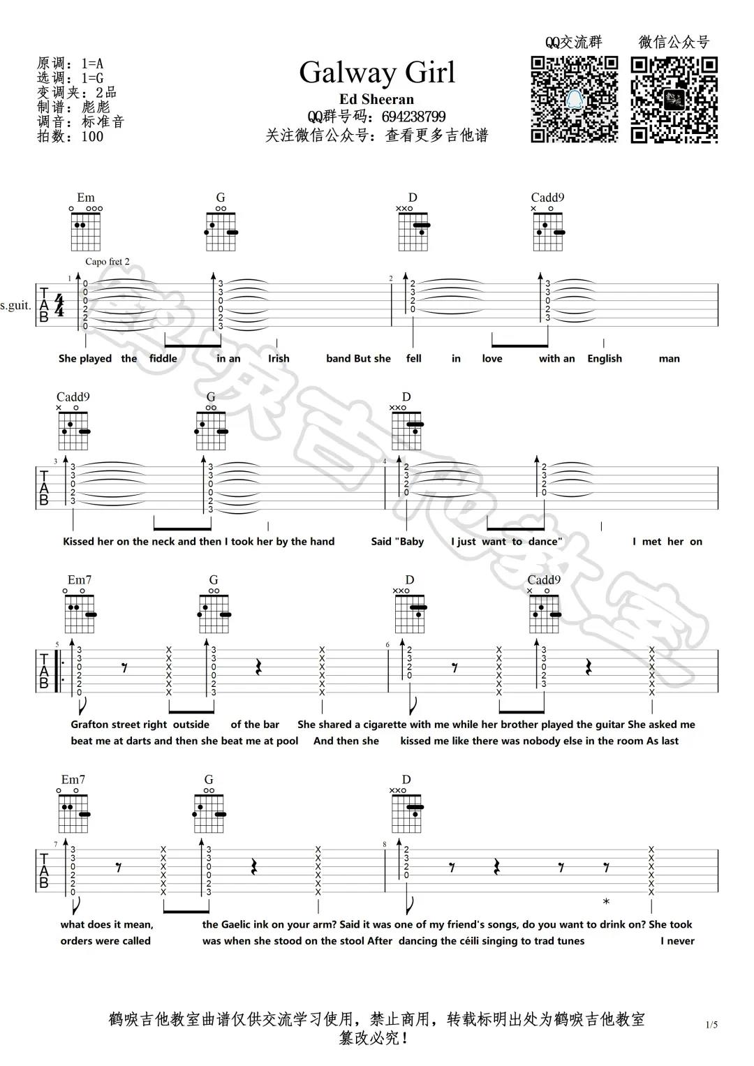 曲谱介绍: Ed,sheeran《GalwayGirl​》吉他弹唱谱,采用G调指法编配,共有5张高清图谱。