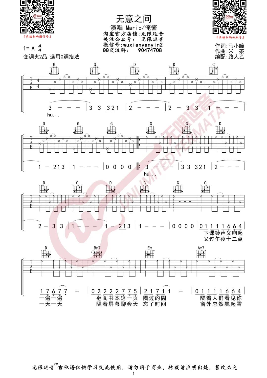 曲谱介绍: Mario,俺酱《无意之间》吉他弹唱谱,采用G调指法编配,共有3张高清图谱。