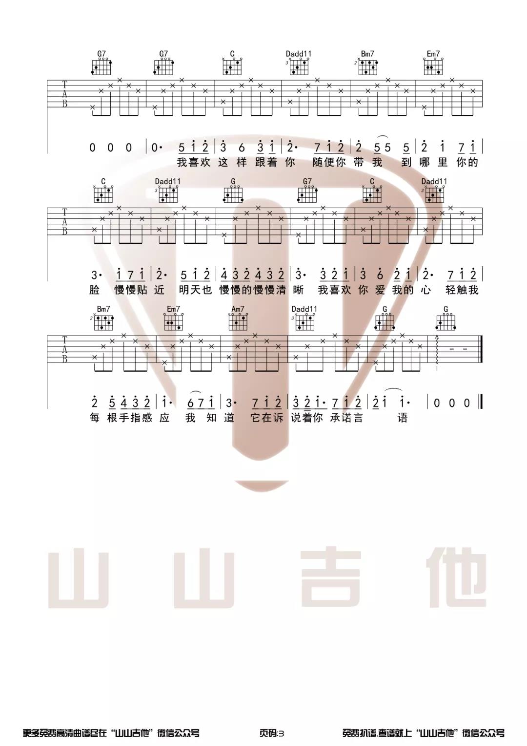 曲谱介绍: 陈洁仪《喜欢你》吉他弹唱谱,采用G调指法编配,共有3张高清图谱。