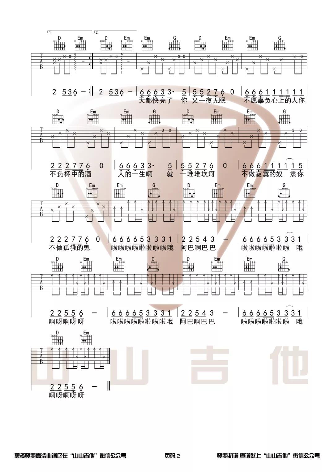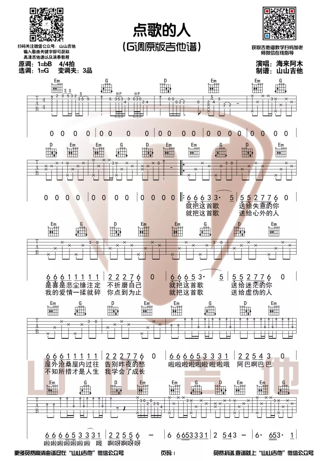曲谱介绍: 海来阿木《点歌的人》吉他弹唱谱,采用G调指法编配,共有2张高清图谱,免翻页排版设计。