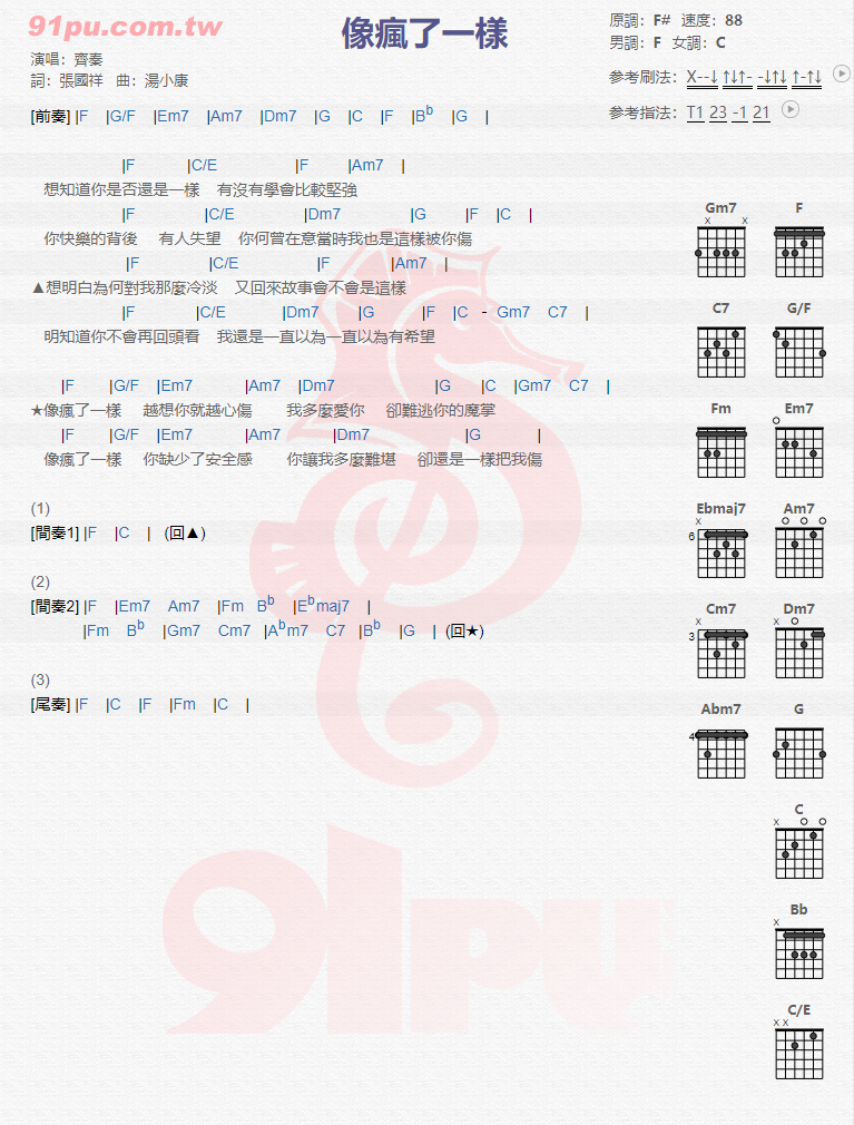 当前位置:琴谱网>吉他弹唱>像疯了一样