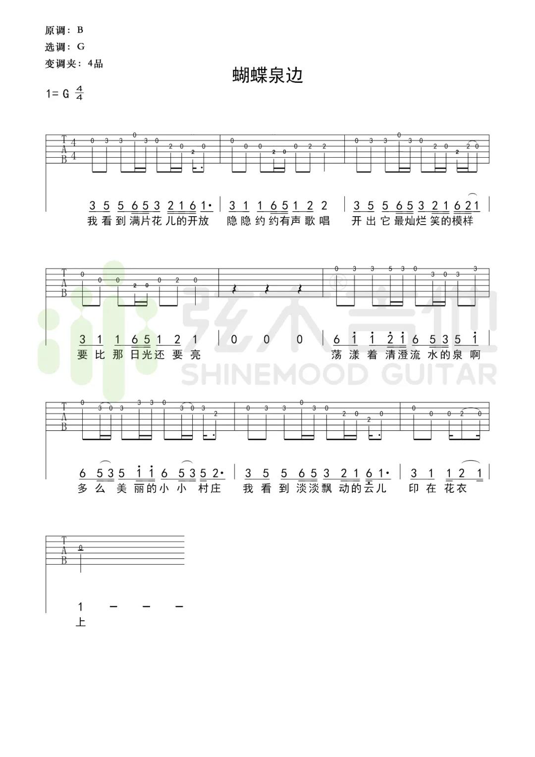 曲谱介绍: 黄雅莉《蝴蝶泉边()》吉他独奏谱,采用G调指法编配,共有1张高清图谱,免翻页排版设计。
