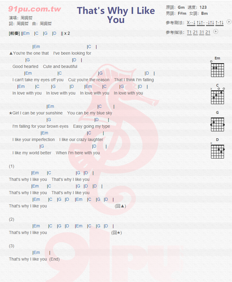 Thats Why I Like You吉他谱 - 周兴哲 - G调吉他弹唱谱
