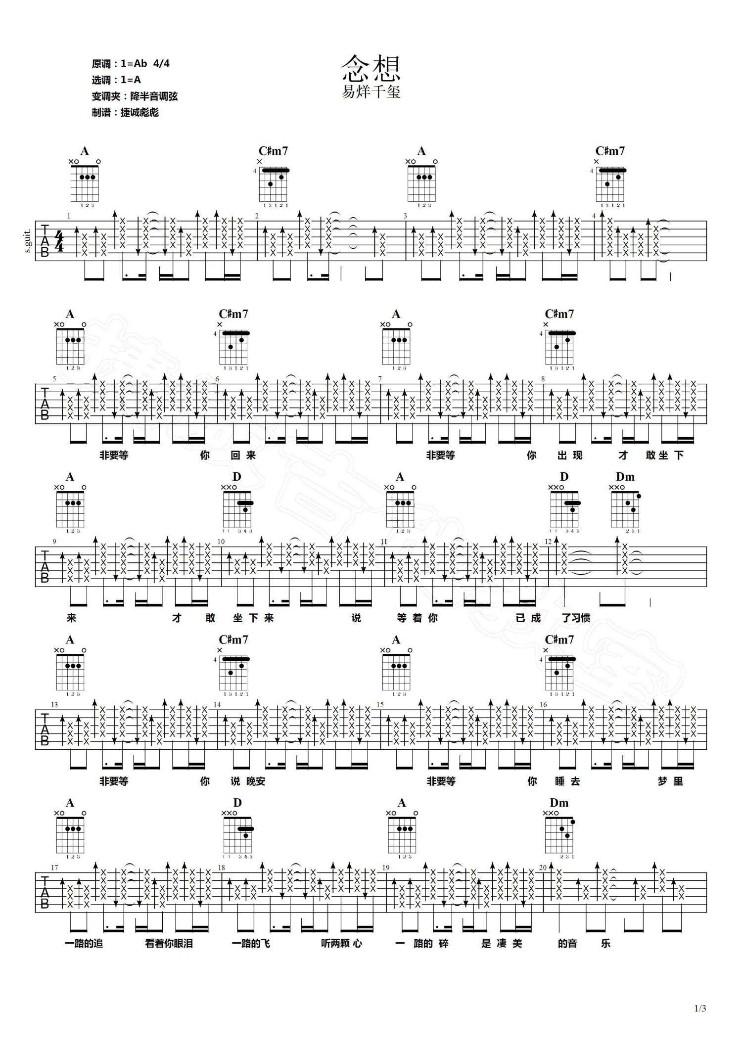念想吉他谱 - 易烊千玺 - A调吉他弹唱谱