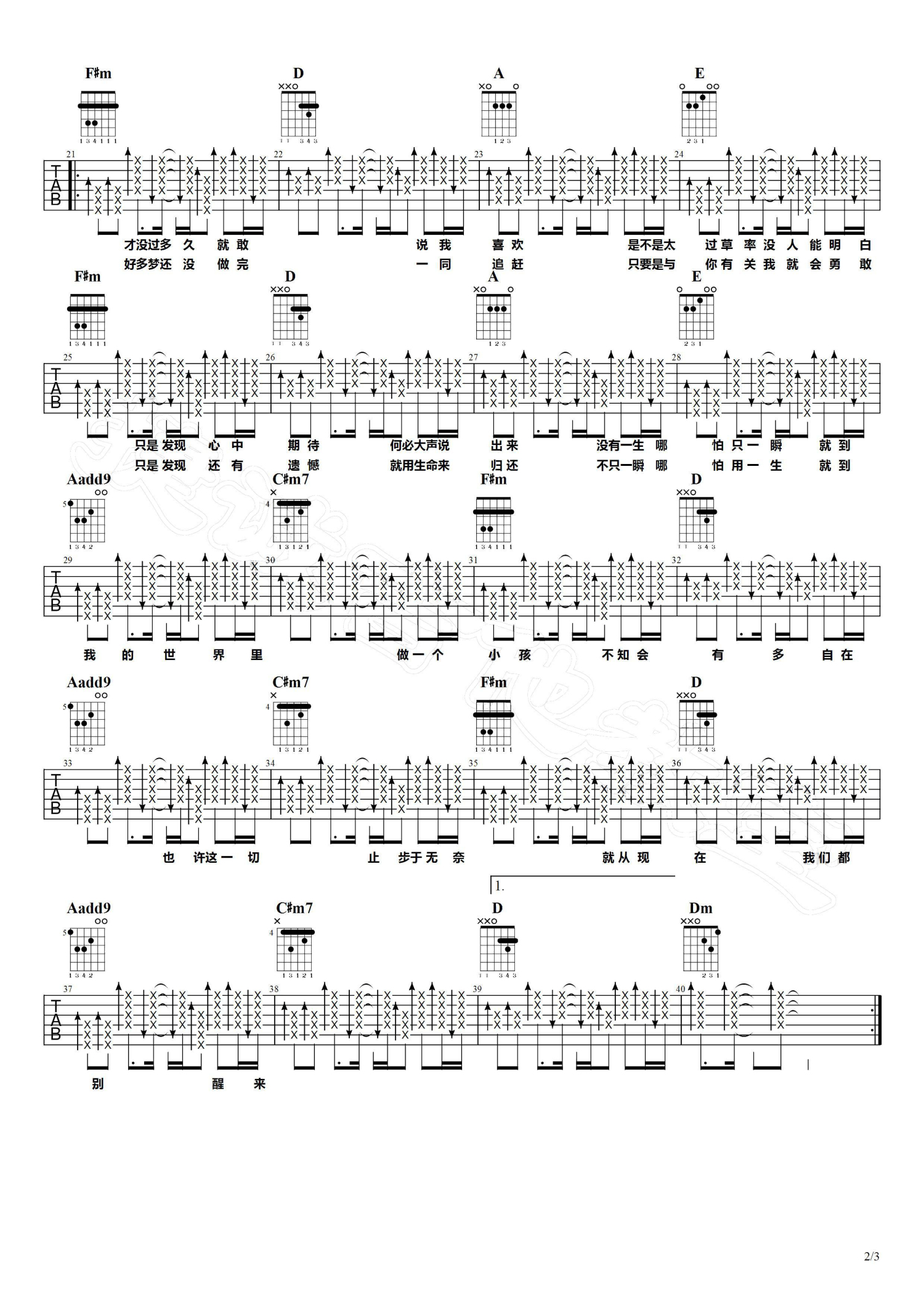 曲谱介绍: 最近很火的电影《少年的你》的情感曲,有易烊千玺演唱,“只有是与你相关,我就会大胆”,揪心感人的歌词搭配精致抒怀的曲调,易烊千玺内敛且和顺的呢喃,跟着吉他和弦的律动,让听众坠入了一场不肯醒来的幻想。A调指法编配,唱原调需要降半音调弦,附上弹唱视频教学,大家可以参考视频里老师扫弦的节奏型以及和弦的一些变化。