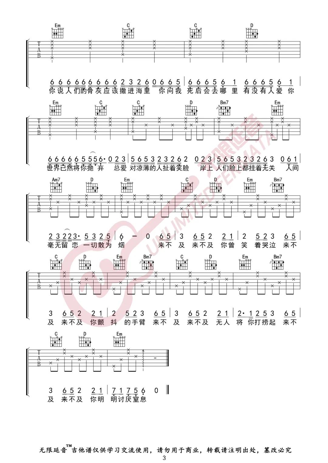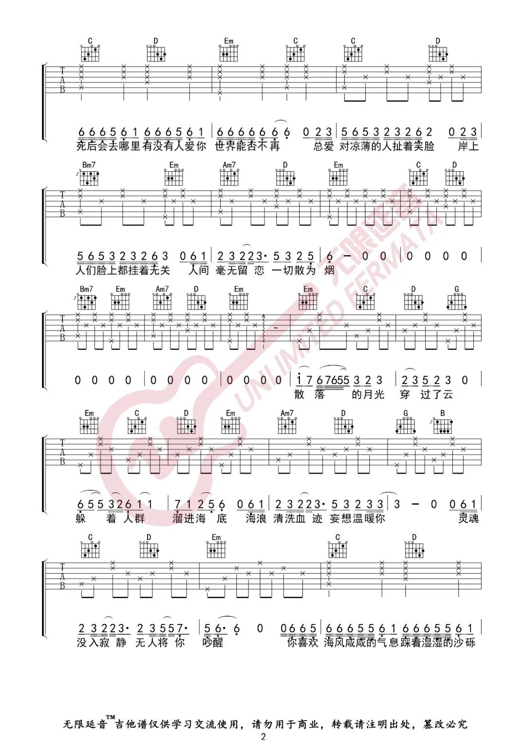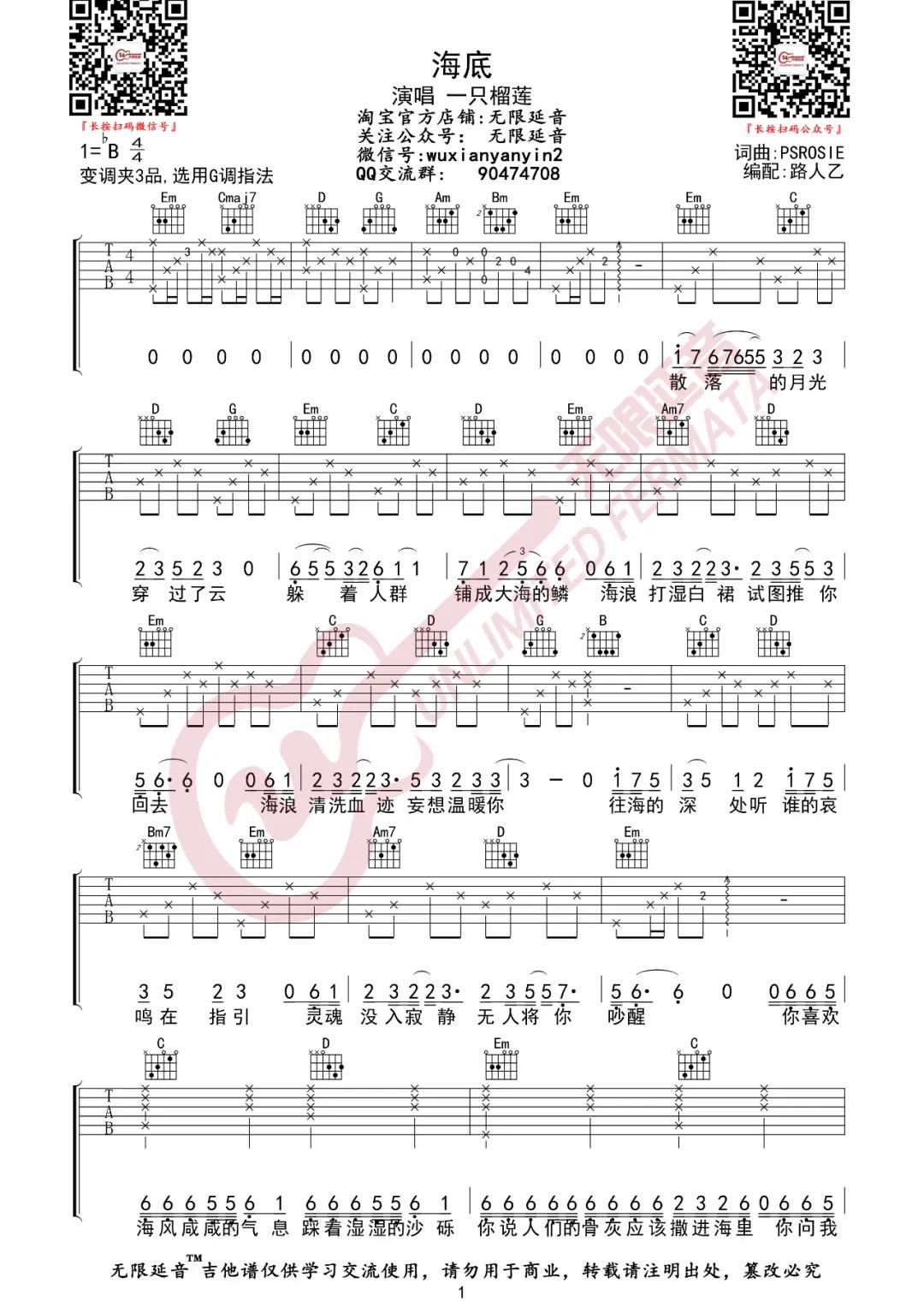 曲谱介绍: 一支榴莲《海底》吉他弹唱谱,采用G调指法编配,共有3张高清图谱。