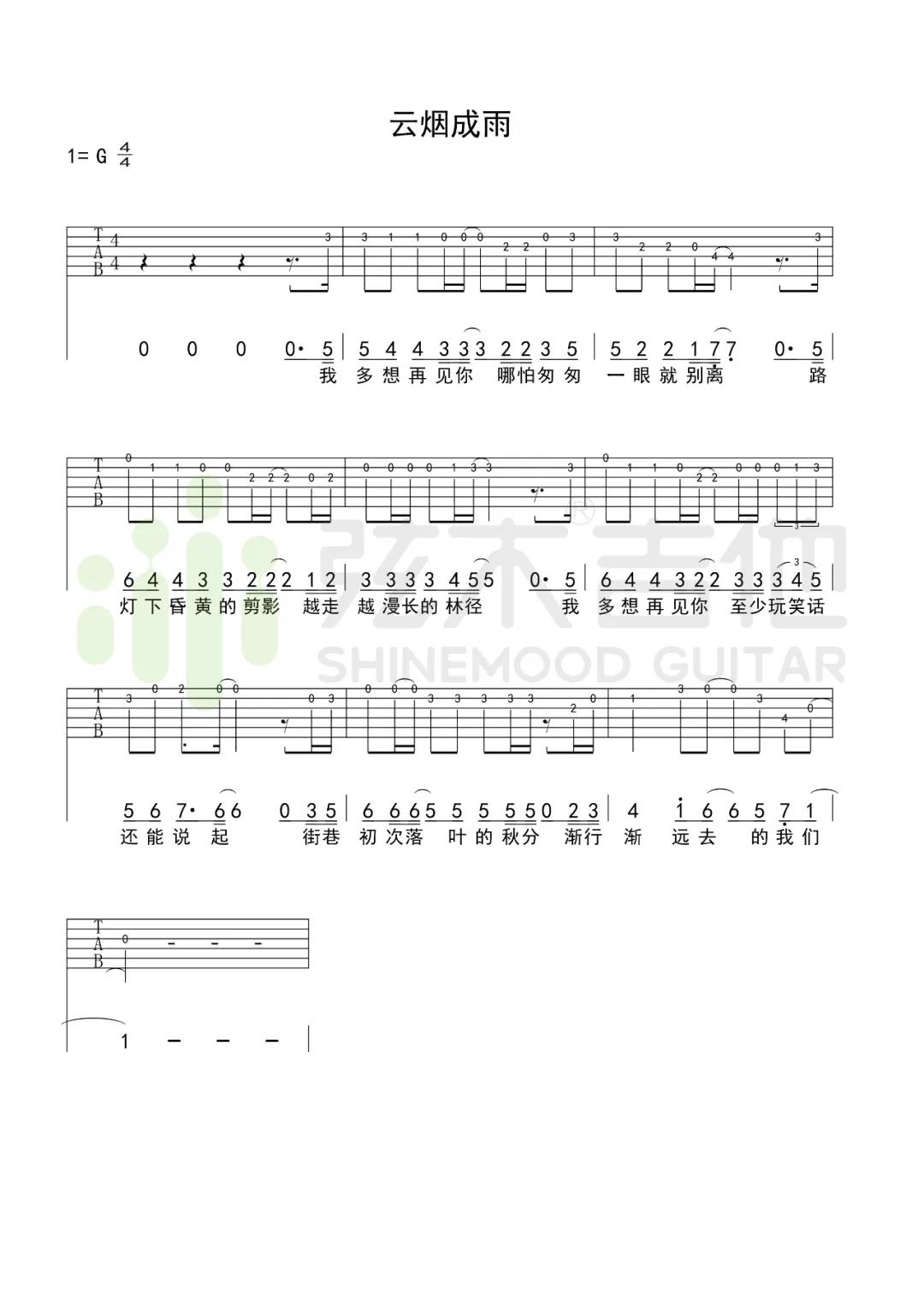 曲谱介绍: 房东的猫《云烟成雨()》吉他独奏谱,采用G调指法编配,共有1张高清图谱,免翻页排版设计。